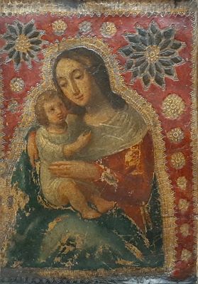 Espagne XVIIIème siècle. Fragment de cuir gaufré peint d'une…