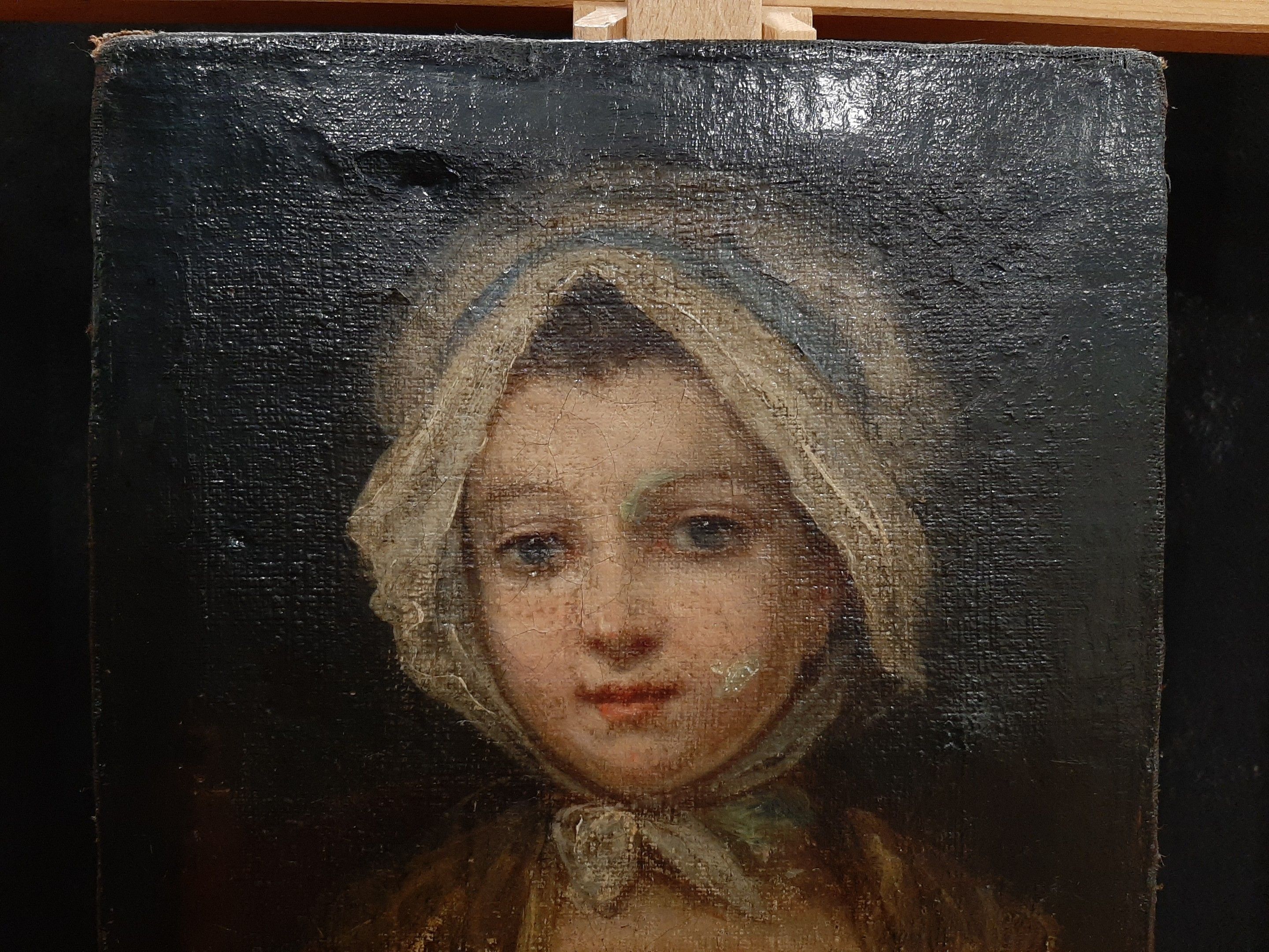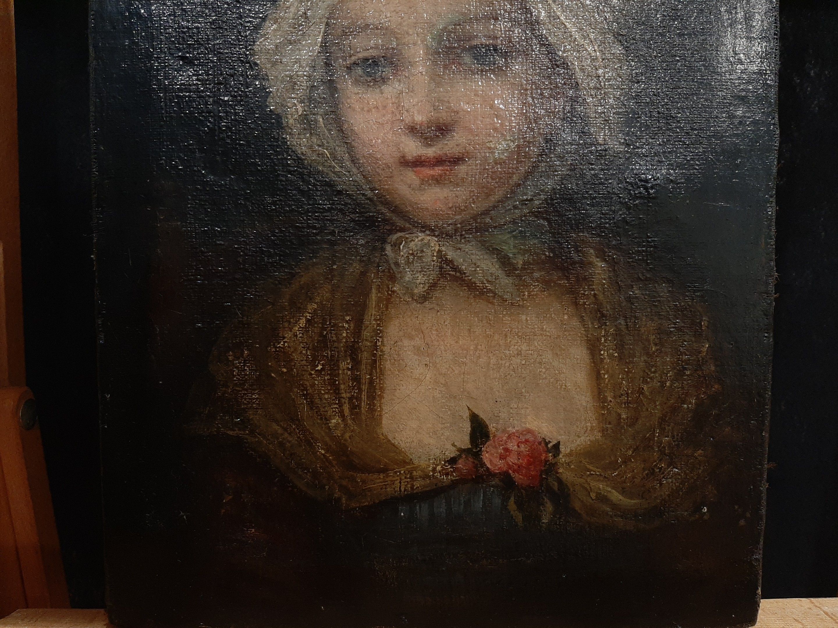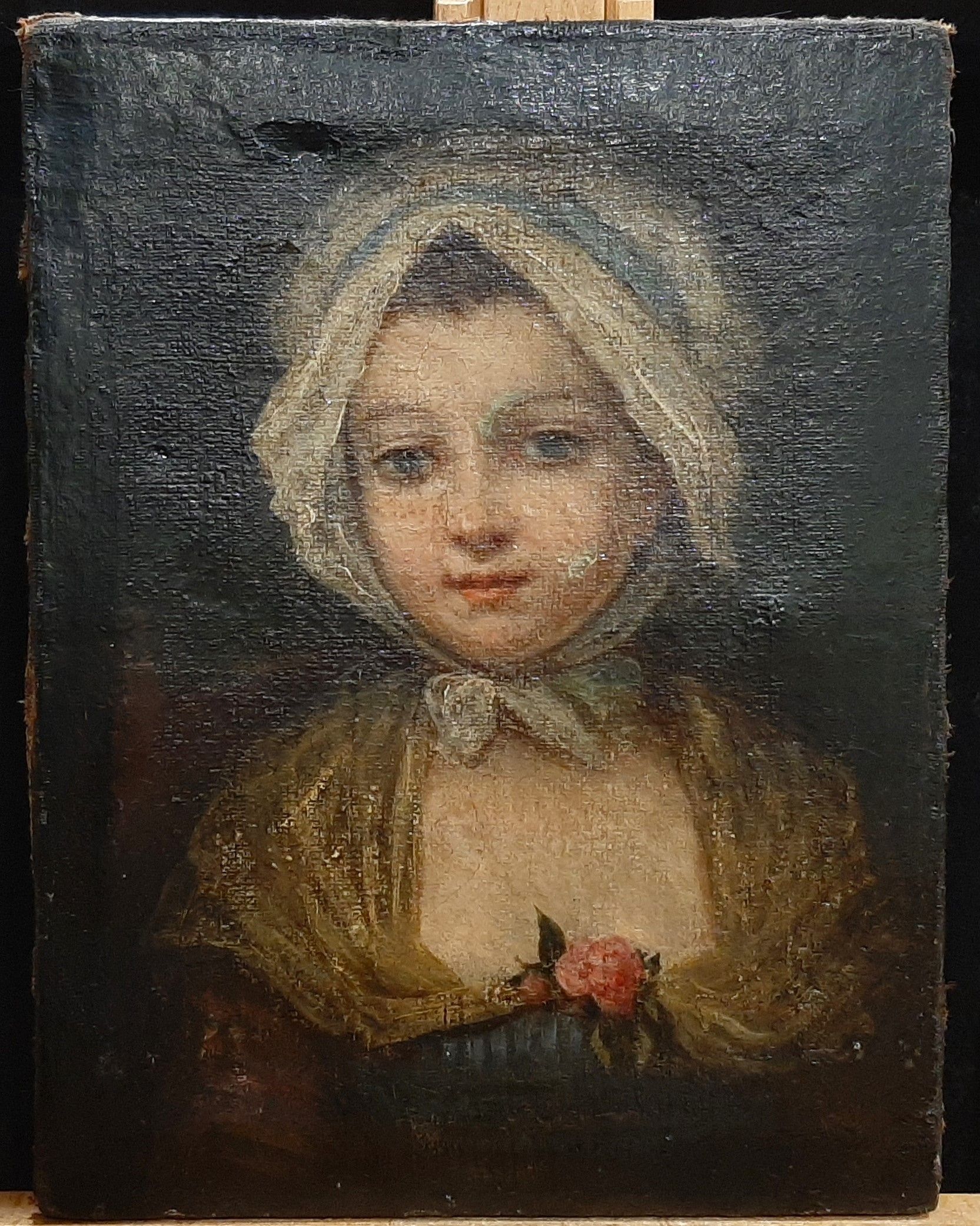 Ecole française du XVIIIème siècle. "Portrait de jeune femme". Huile sur toile 37,2 x 28,4 cm (usures, restaurations sommaires)