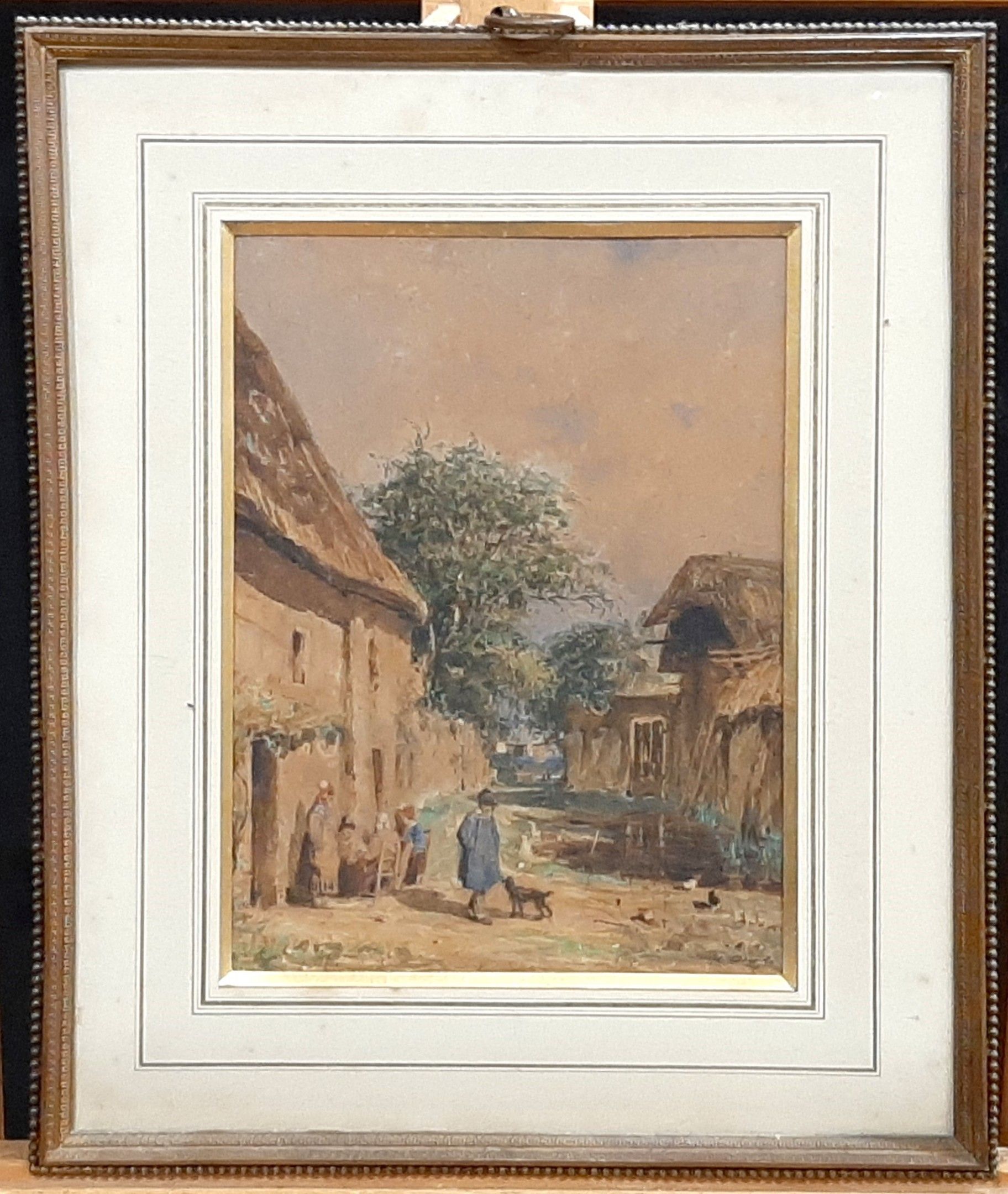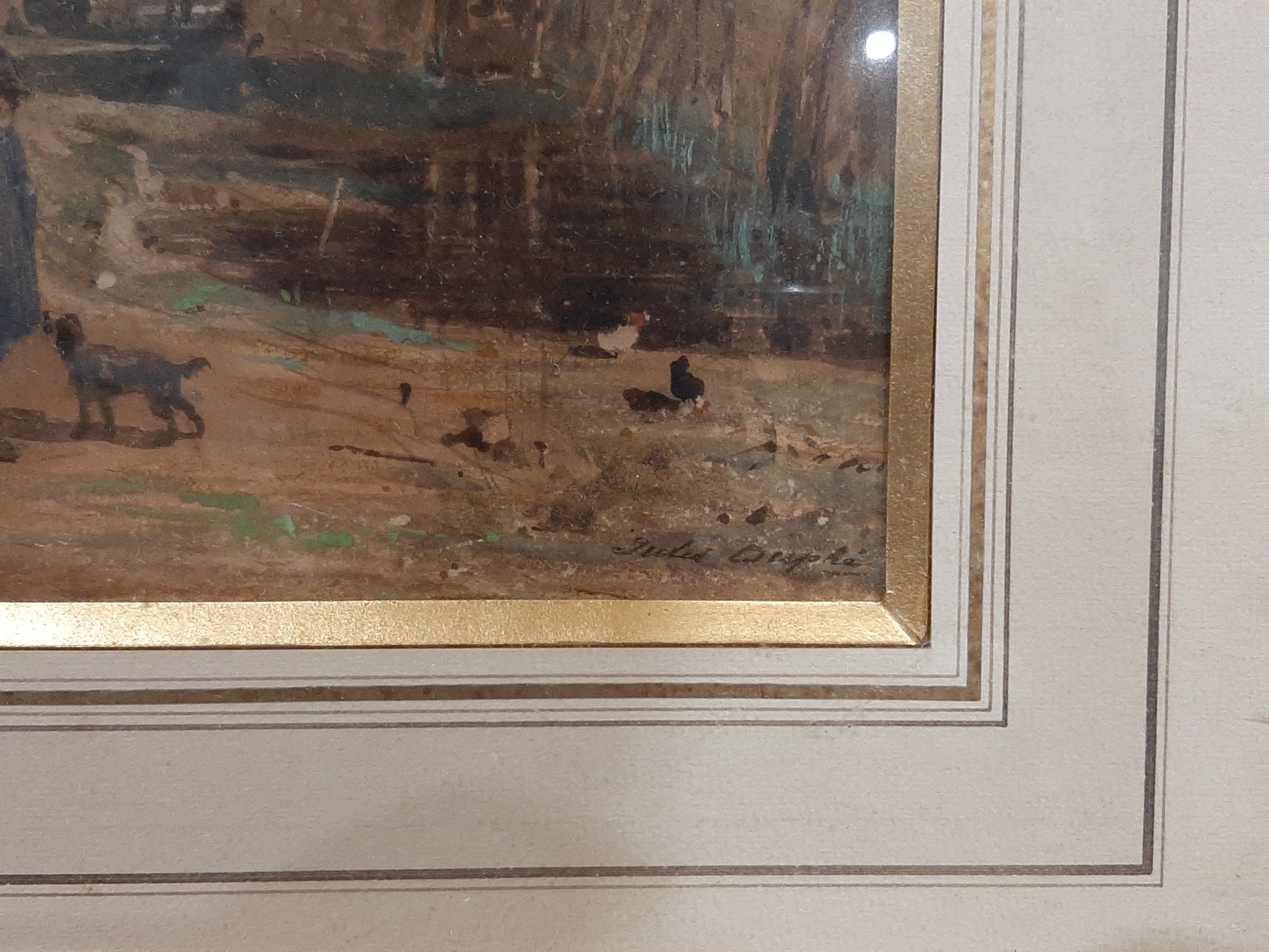 Jules DUPRÉ (1811-1889)"rue de village animée". Aquarelle signée en bas à droite 22,7 x 22,3 cm. (insolée) Encadrée sous verre dans un cadre en bronze.
