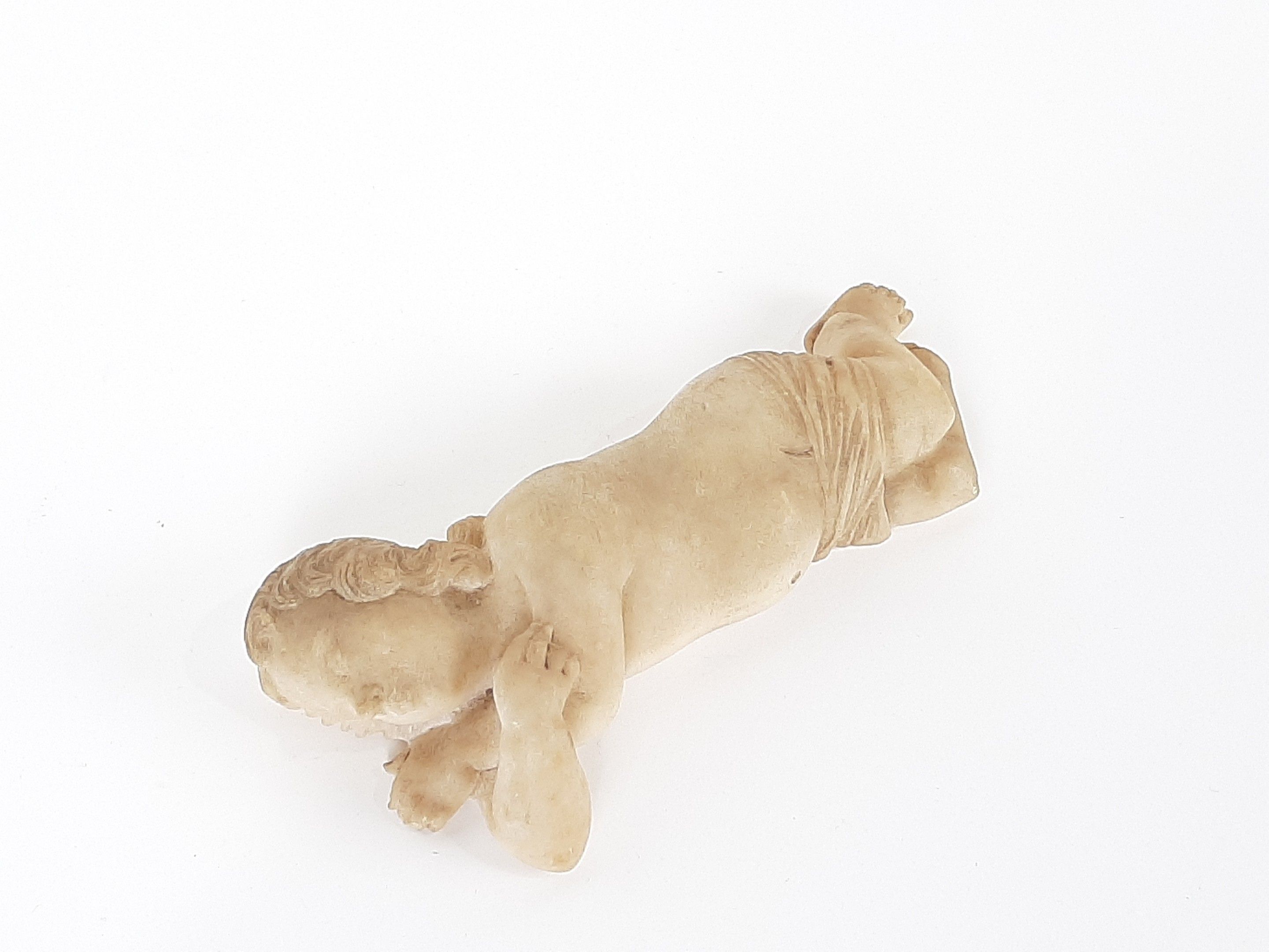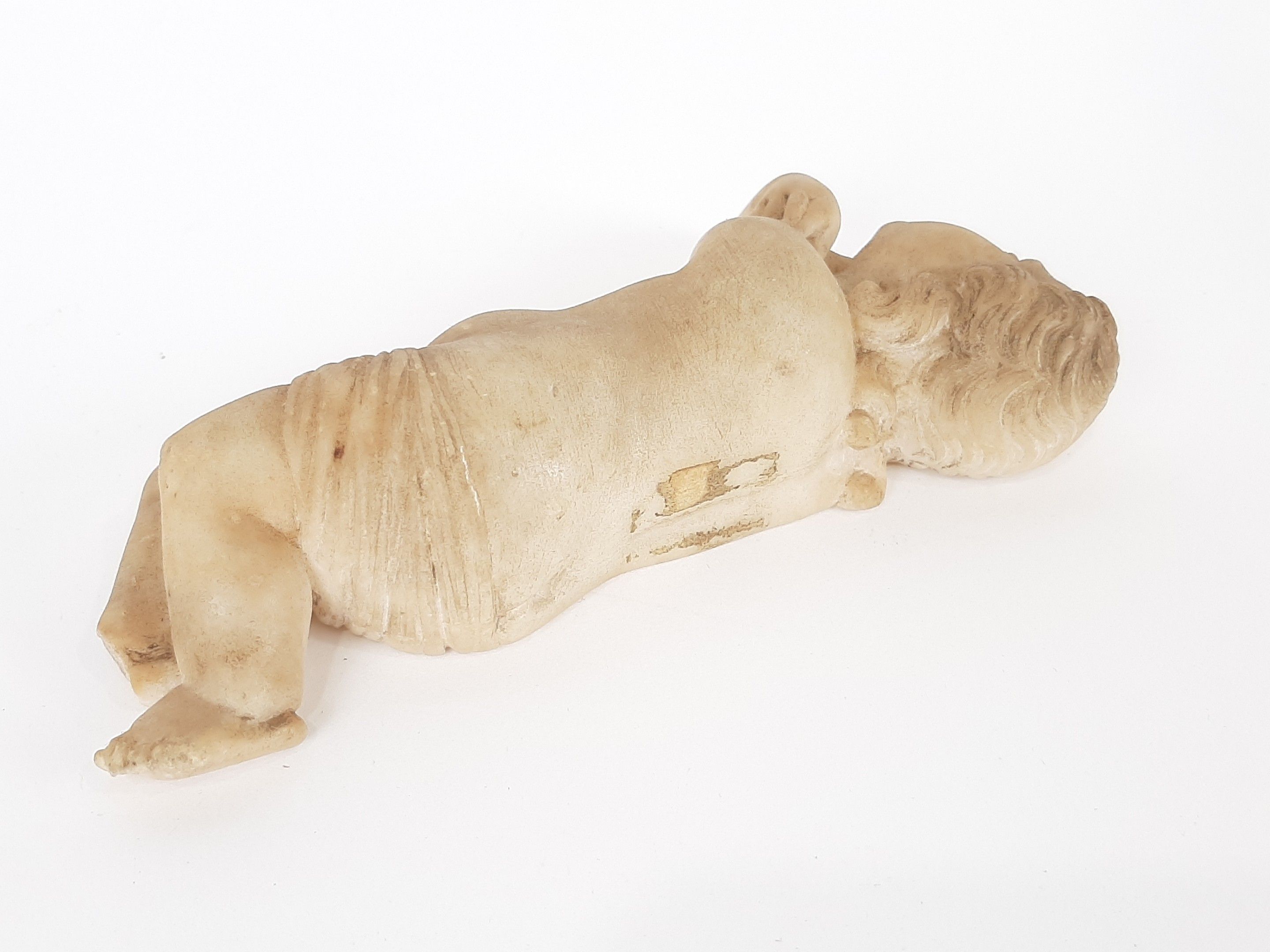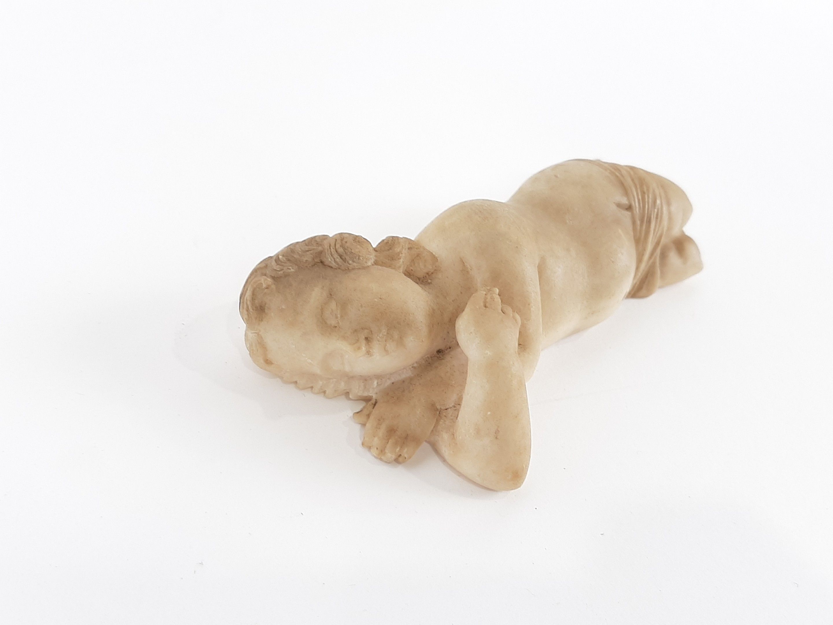 Italie fin XVIIème, début du XVIIIème siècle. Enfant Jésus endormi en marbre blanc sculpté. Longueur : 15 cm. (Un pied manquant, encrassements, méplat inférieur probablement postérieur)