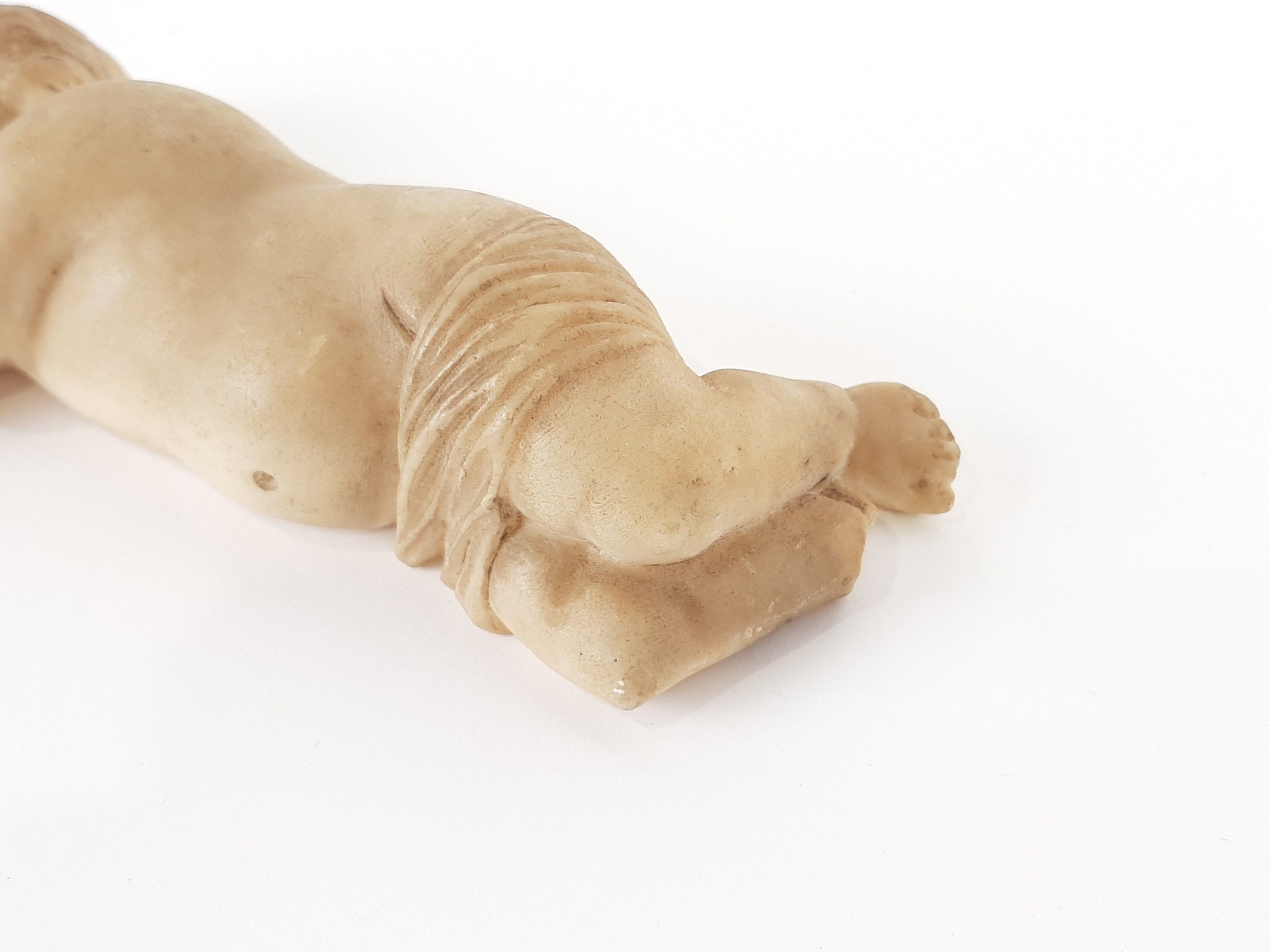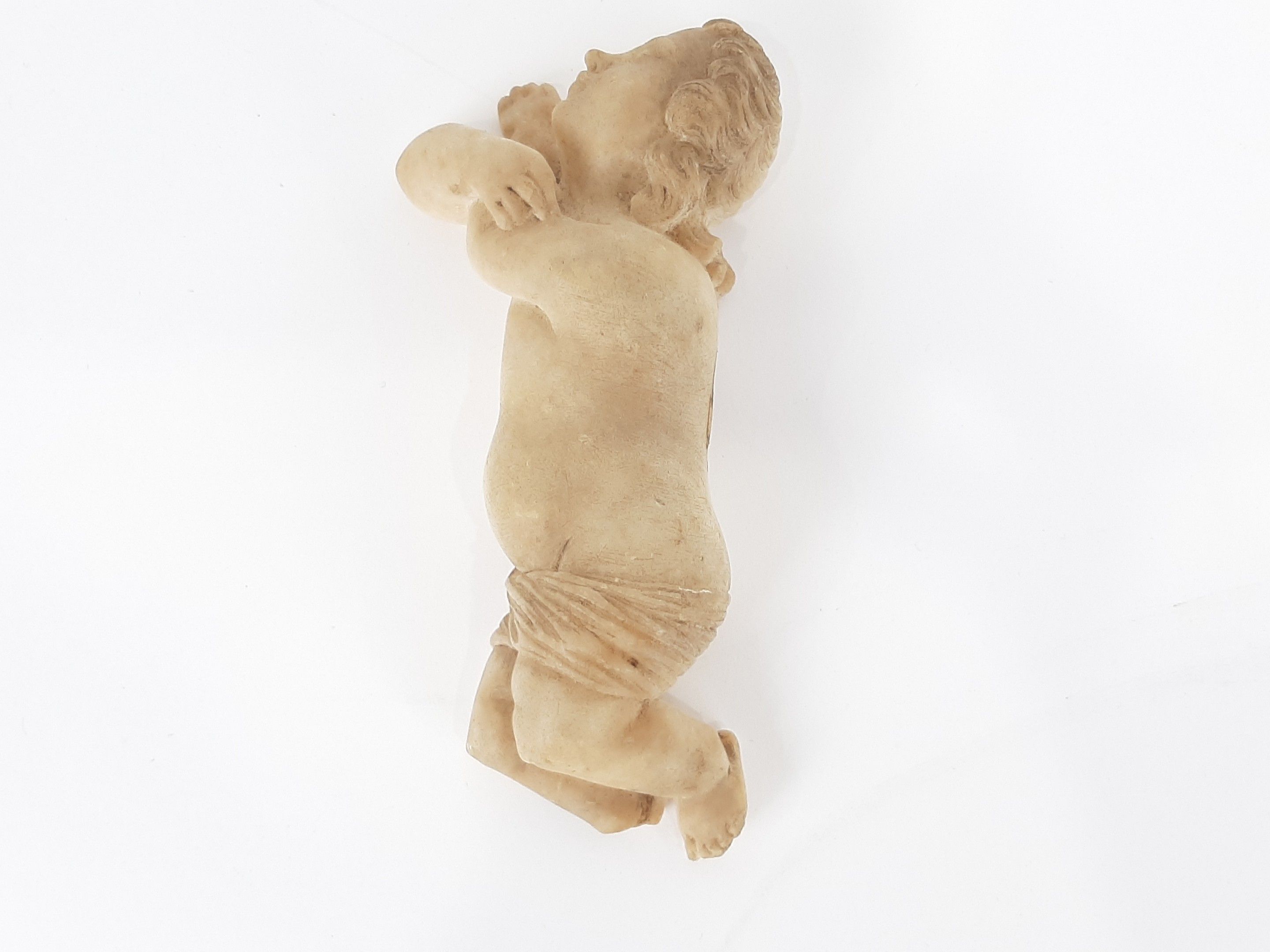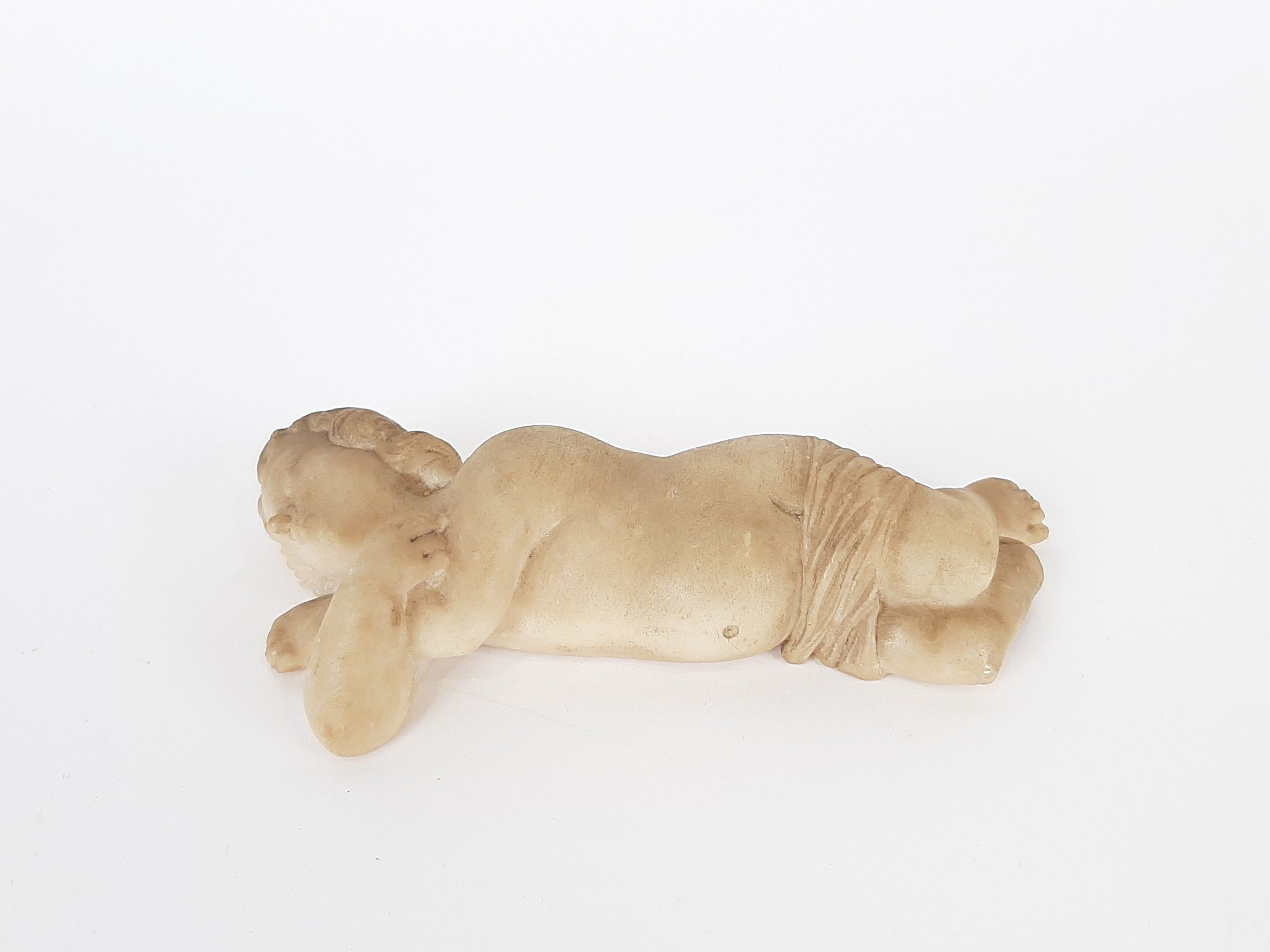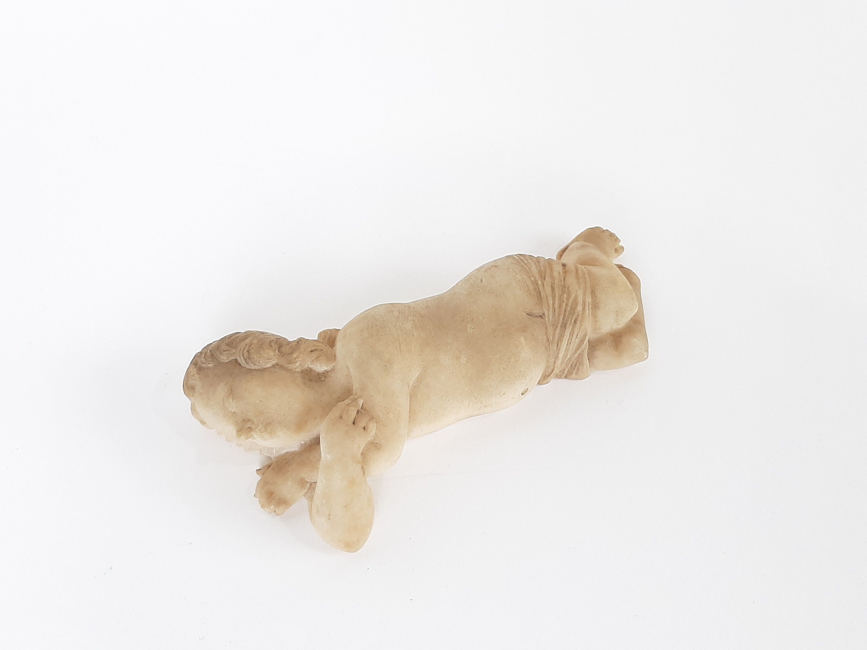 Italie fin XVIIème, début du XVIIIème siècle. Enfant Jésus endormi en marbre blanc sculpté. Longueur : 15 cm. (Un pied manquant, encrassements, méplat inférieur probablement postérieur)