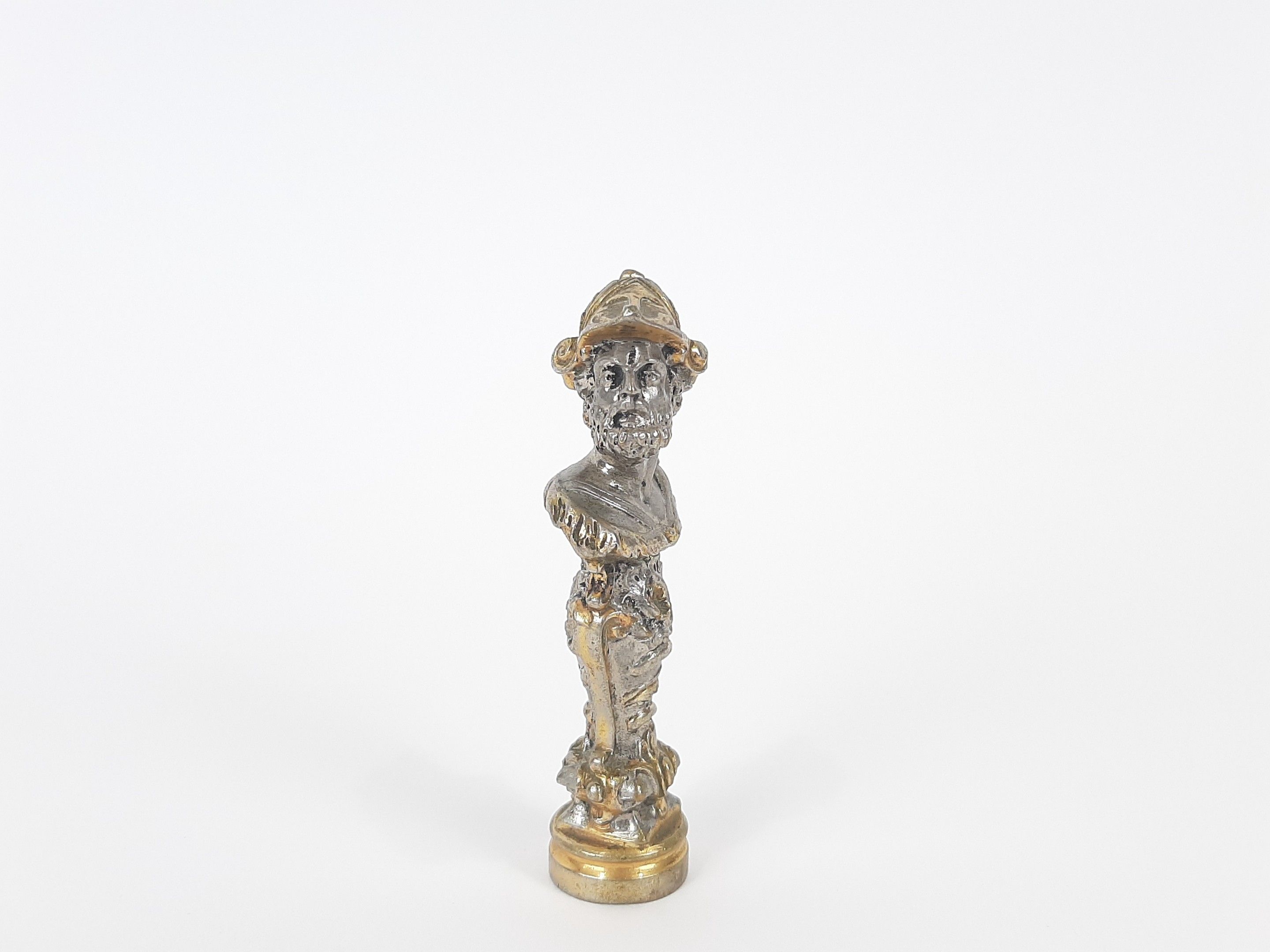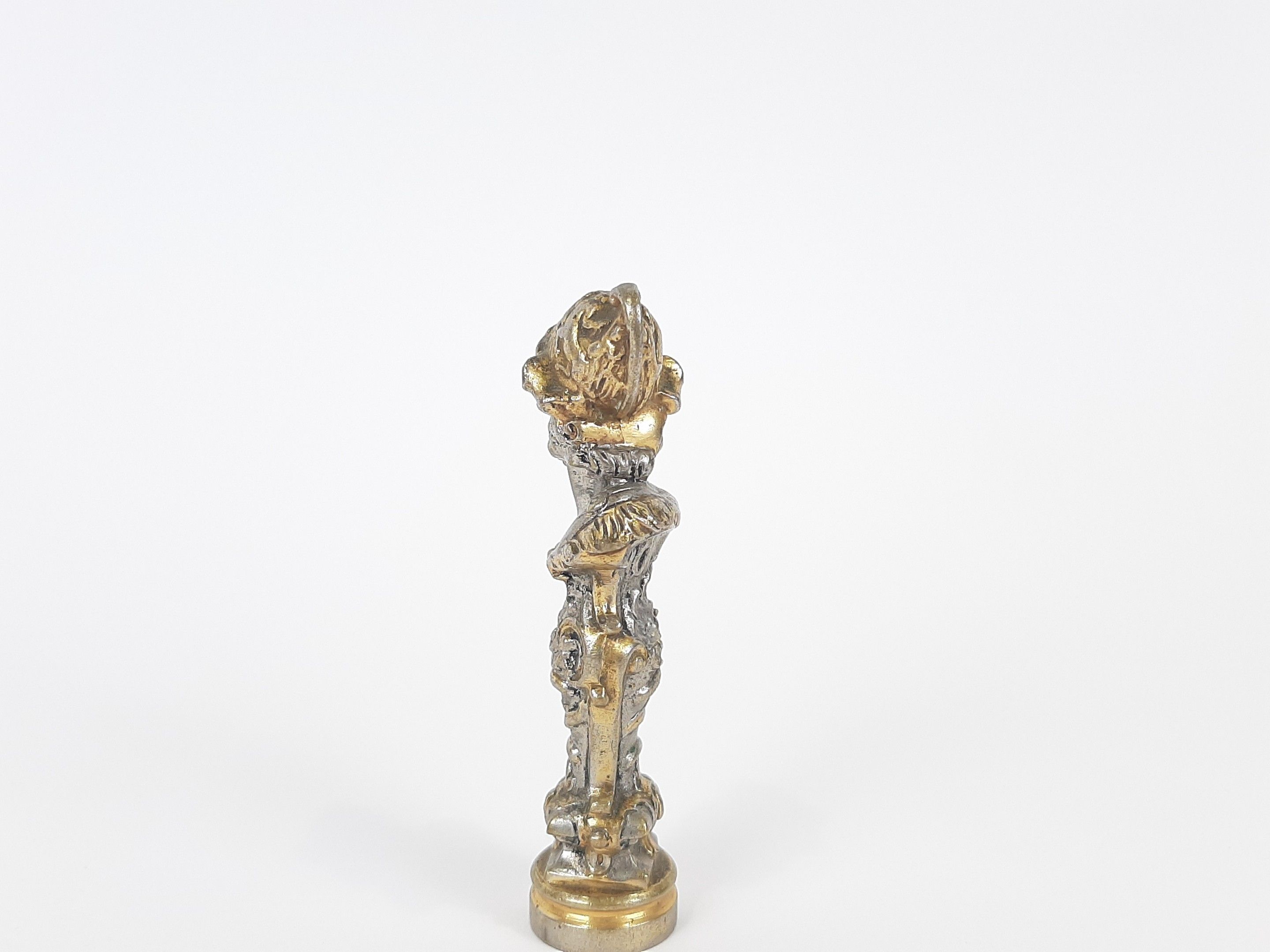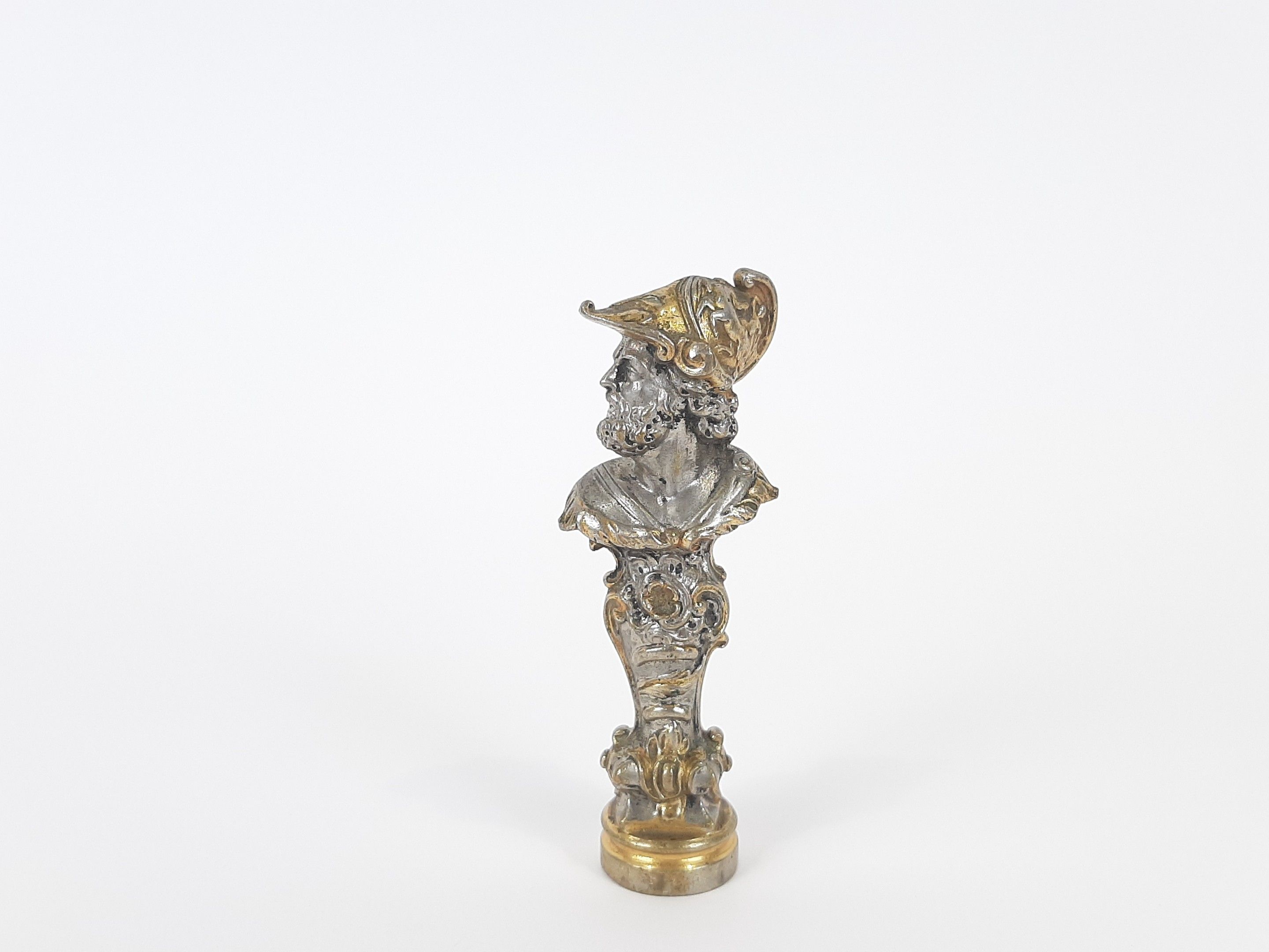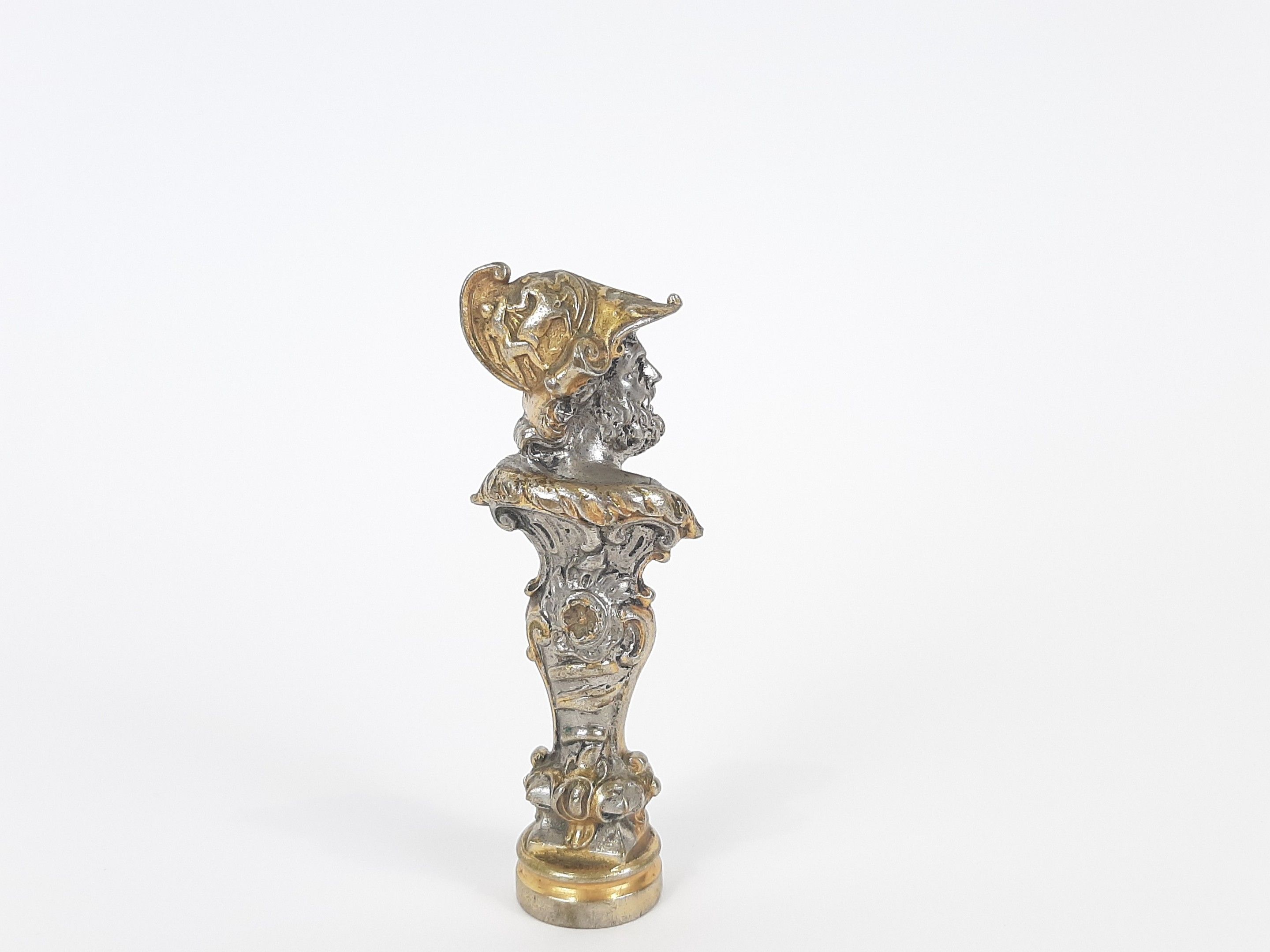 Fin du XIXème siècle. Sceau à cacheter dans le goût de la Renaissance maniériste en bronze à double patine argentée et dorée figurant un terme casqué. Hauteur : 11 cm. (usures de patine)