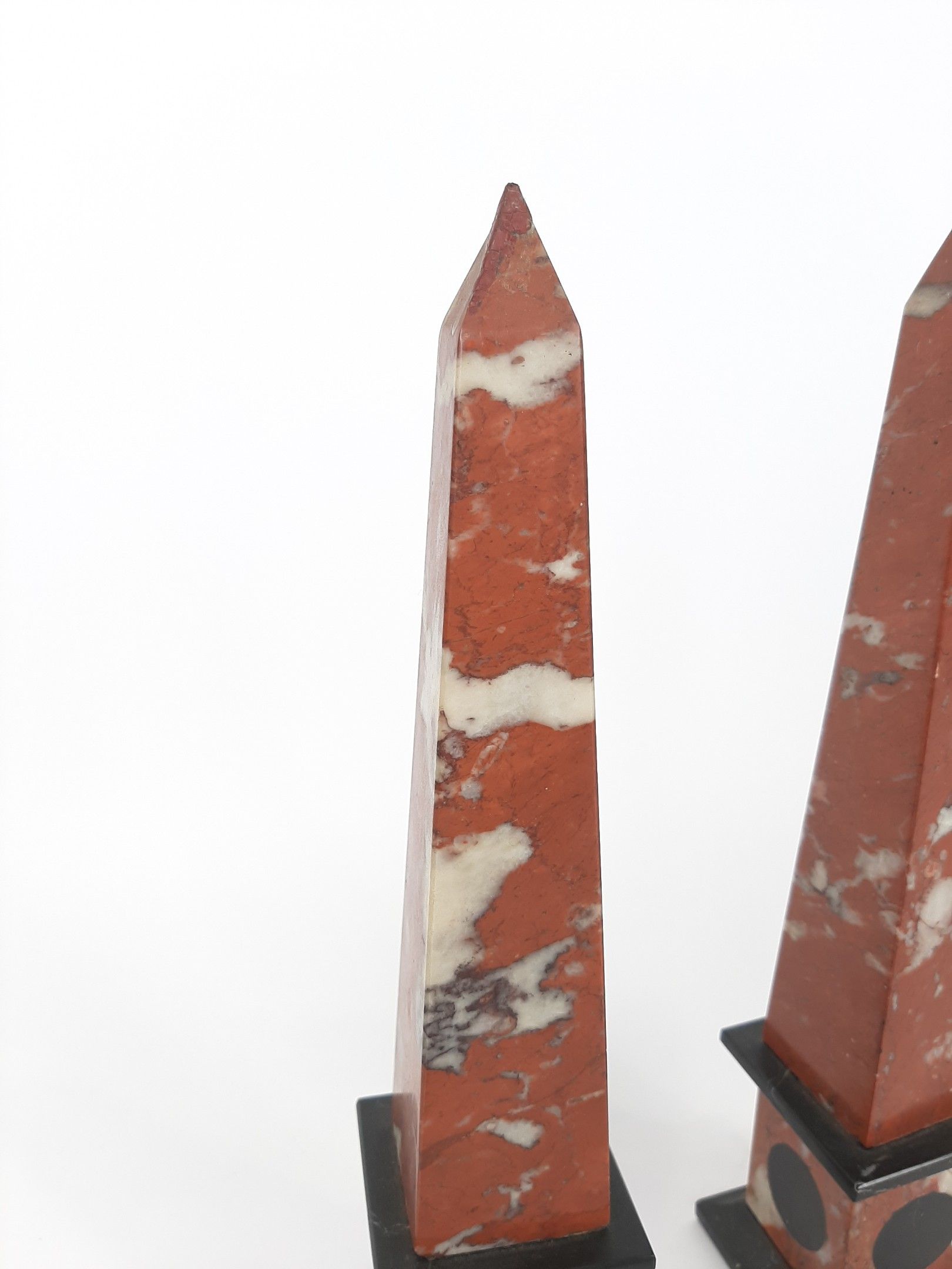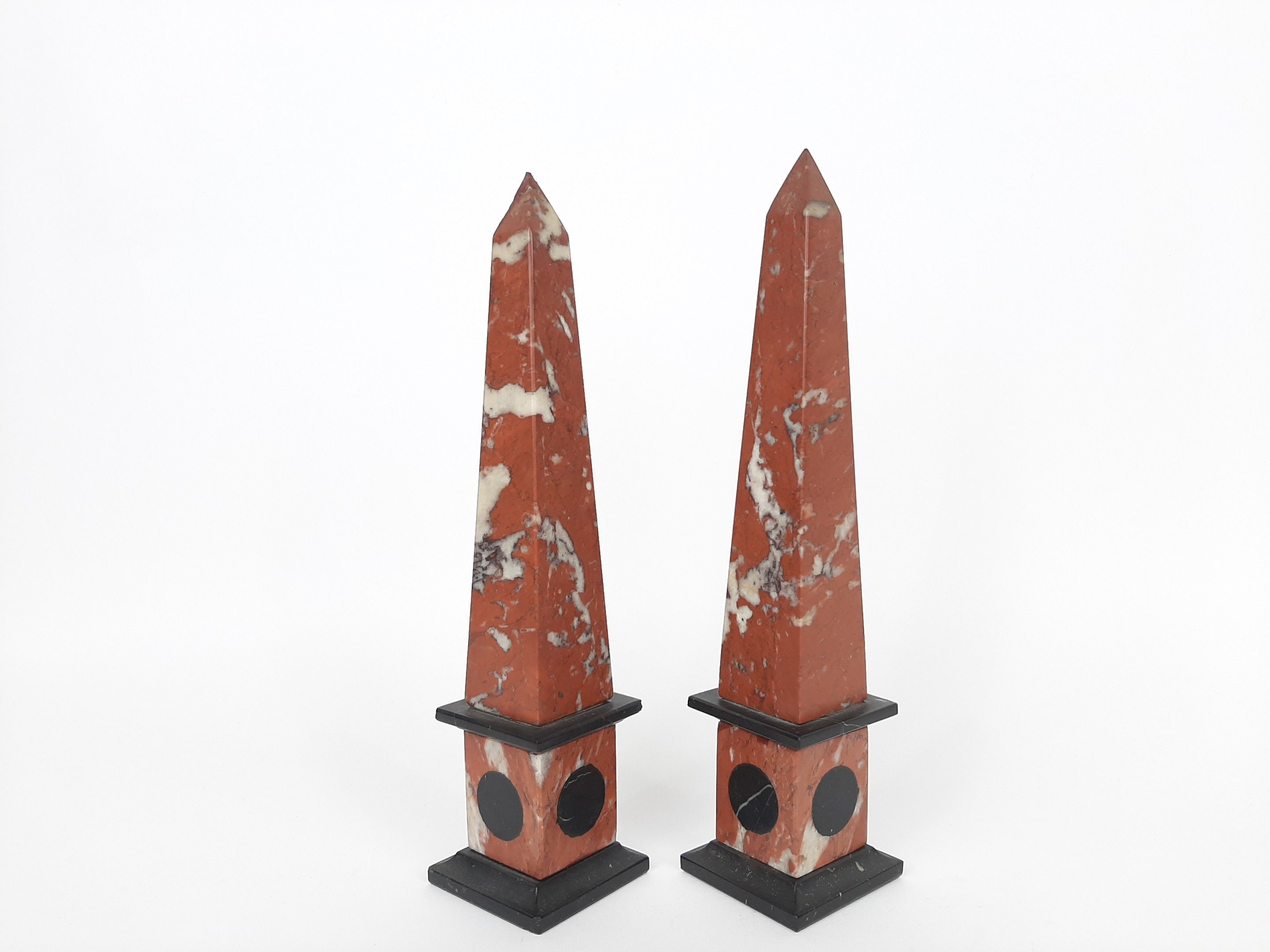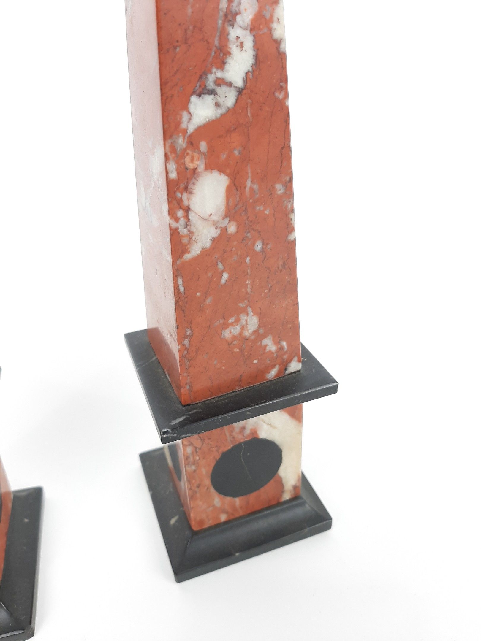 Paire d'obélisques en marbre rouge et marbre noir. Hauteur : 29,8 cm (une restauration à une extrémité, une minuscule égrenure à un angle d'une base).