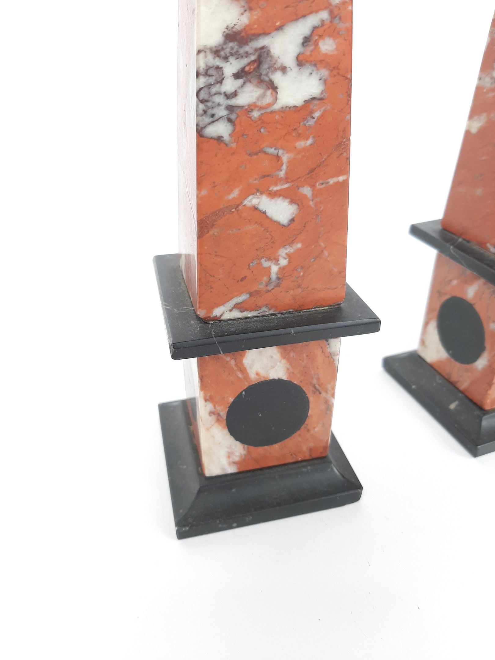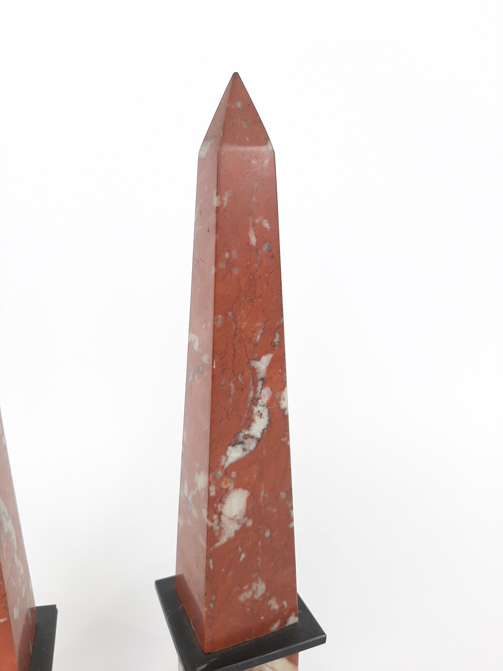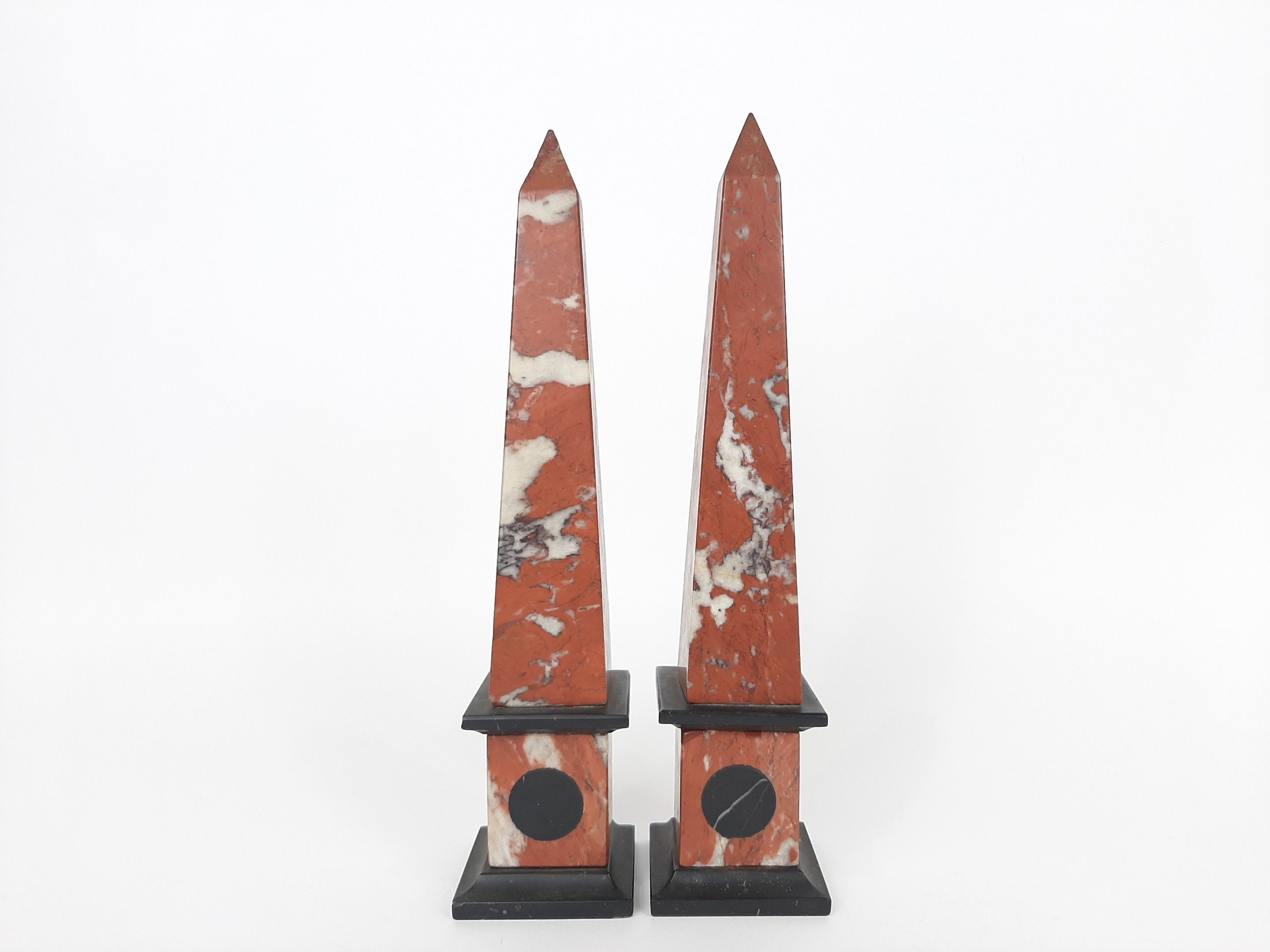 Paire d'obélisques en marbre rouge et marbre noir. Hauteur : 29,8 cm (une restauration à une extrémité, une minuscule égrenure à un angle d'une base).