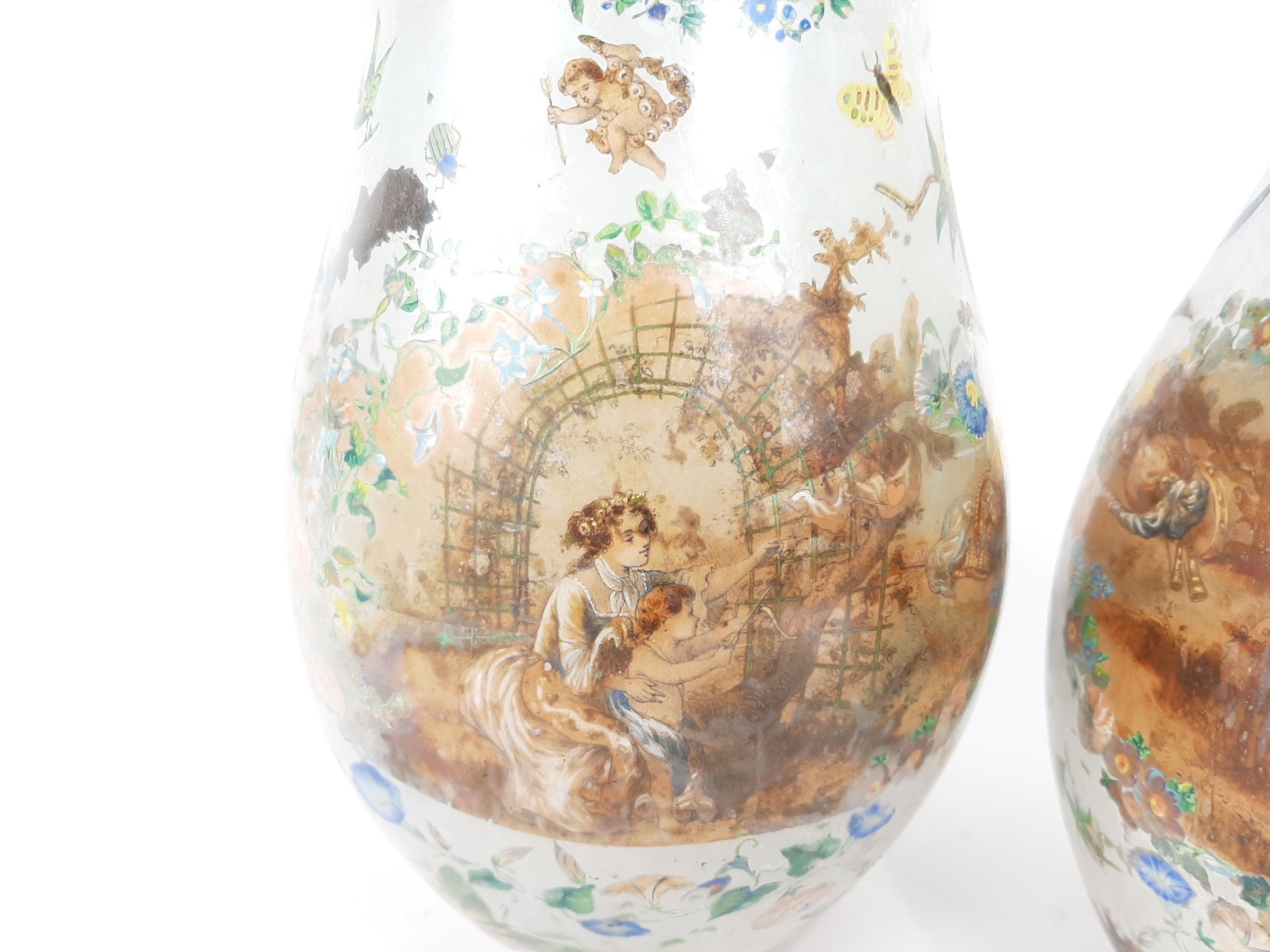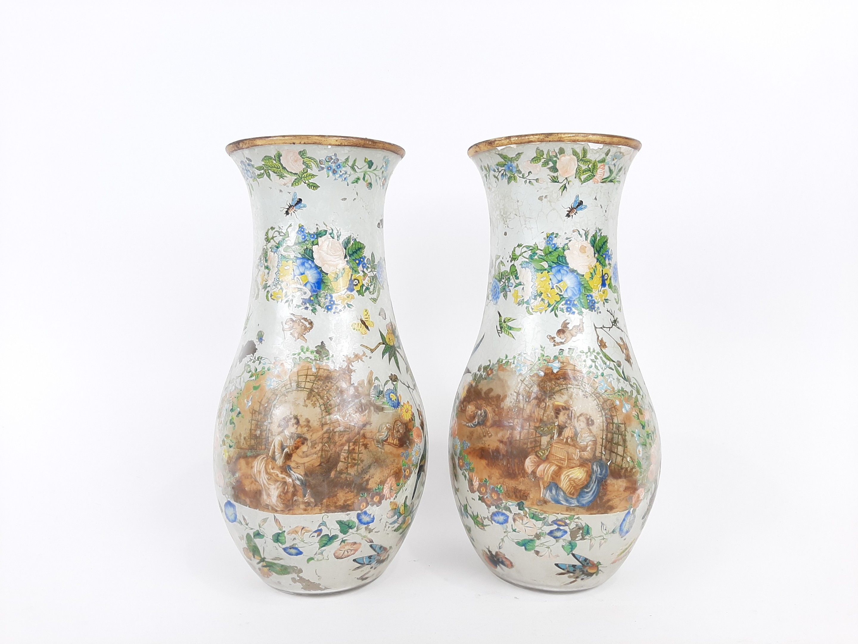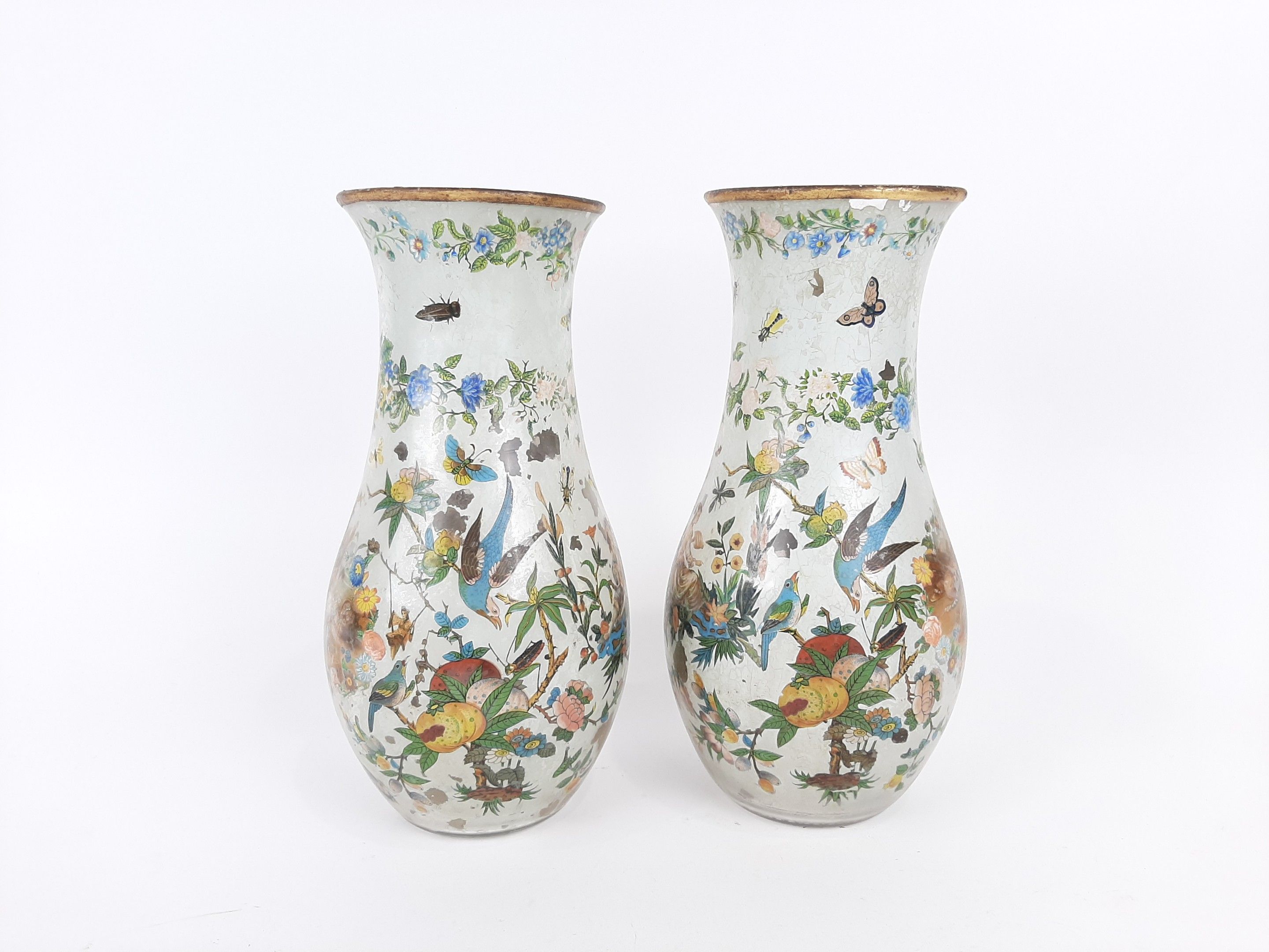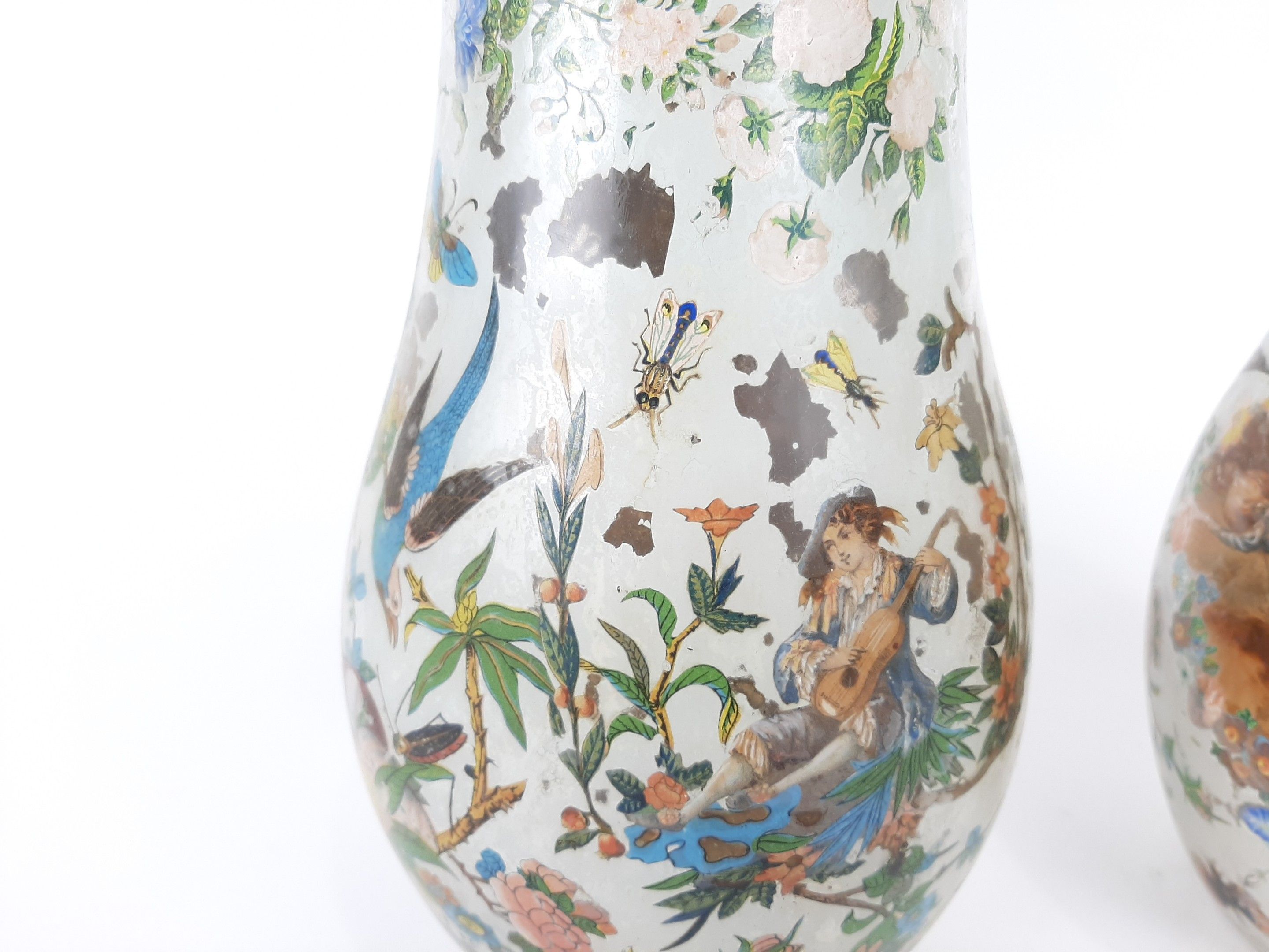 XIXème siècle ou début du XXème siècle. Paire de vases balustres en verre à décor Arte Povera de gravures animalières et végétales traitées en fixé sous verre. Hauteur : 34,5 cm. (importantes usures et décollements des fonds)
