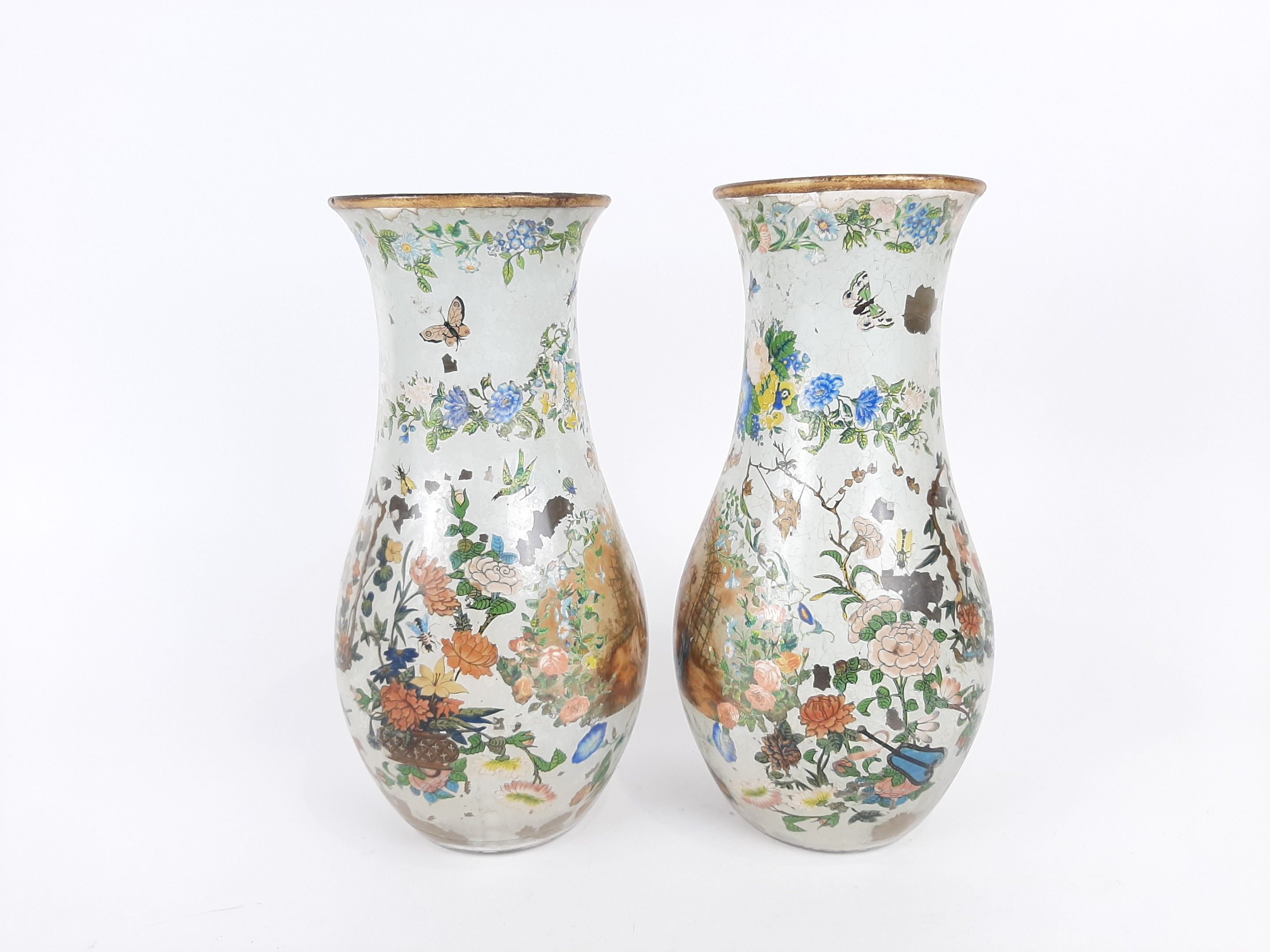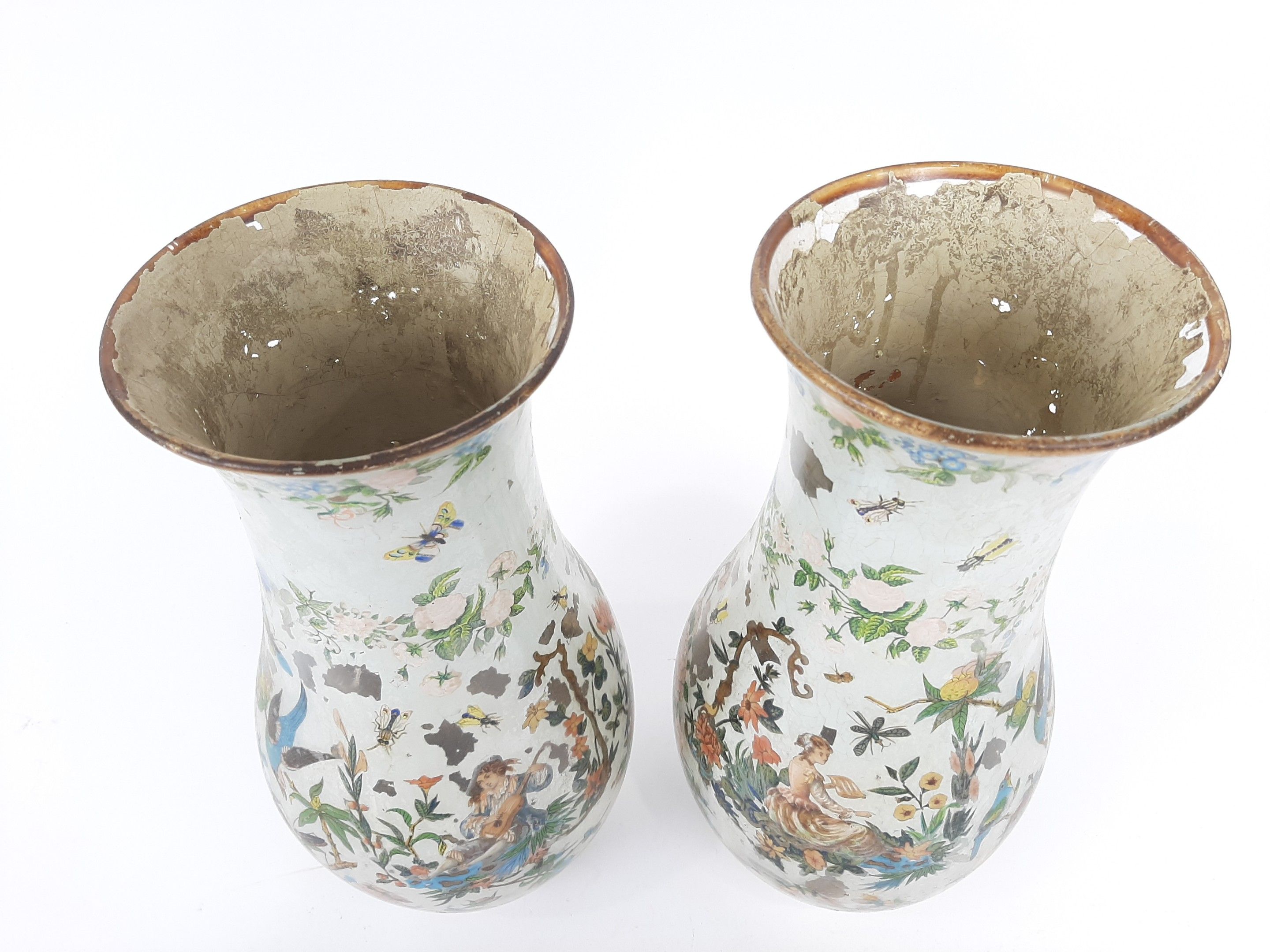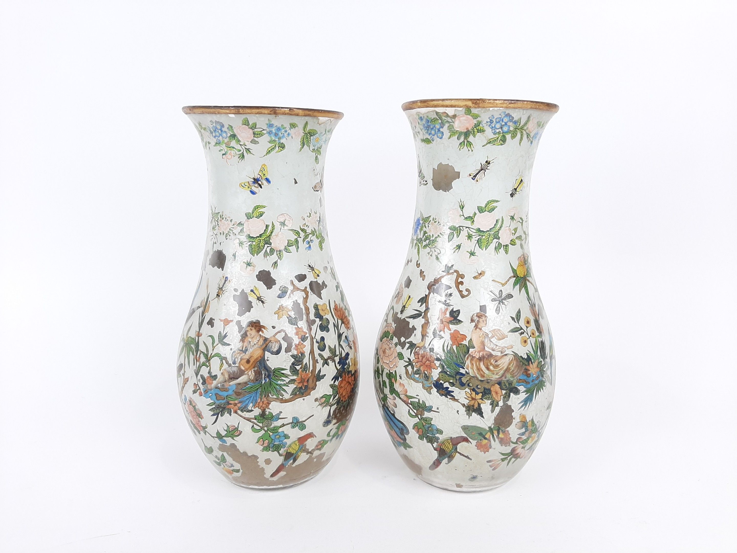 XIXème siècle ou début du XXème siècle. Paire de vases balustres en verre à décor Arte Povera de gravures animalières et végétales traitées en fixé sous verre. Hauteur : 34,5 cm. (importantes usures et décollements des fonds)