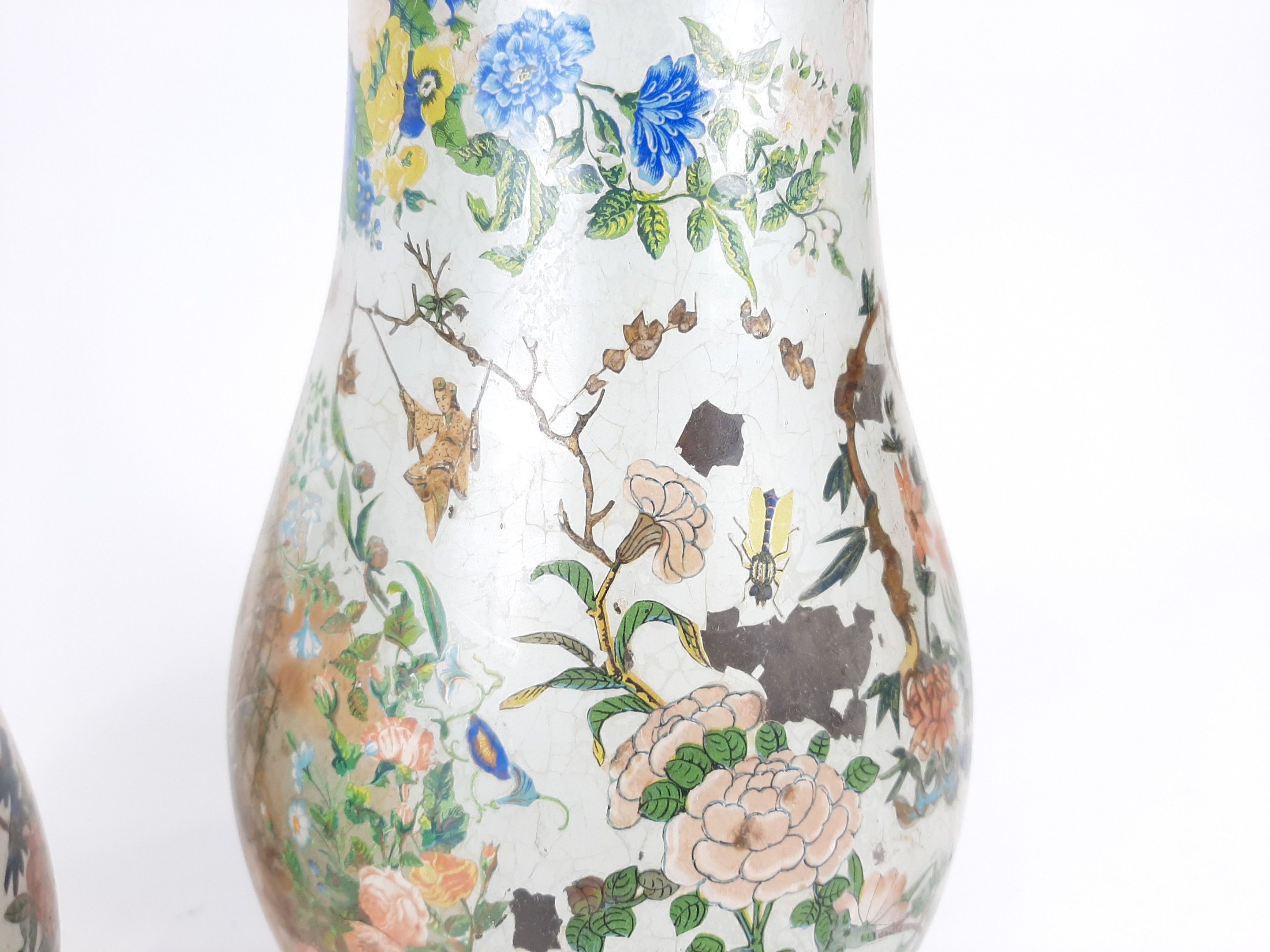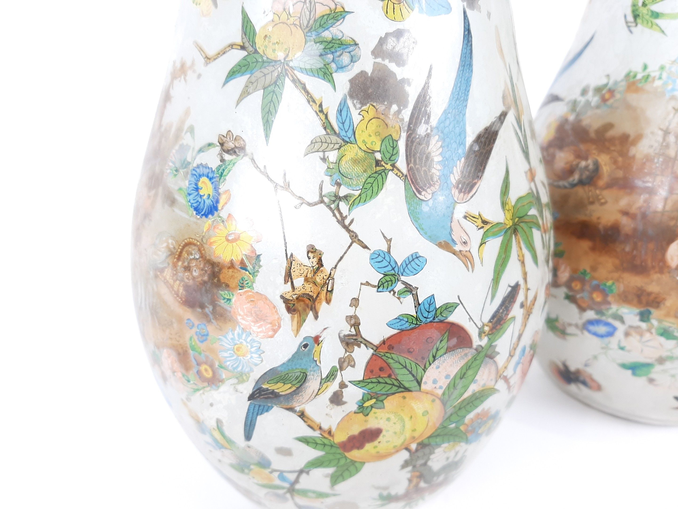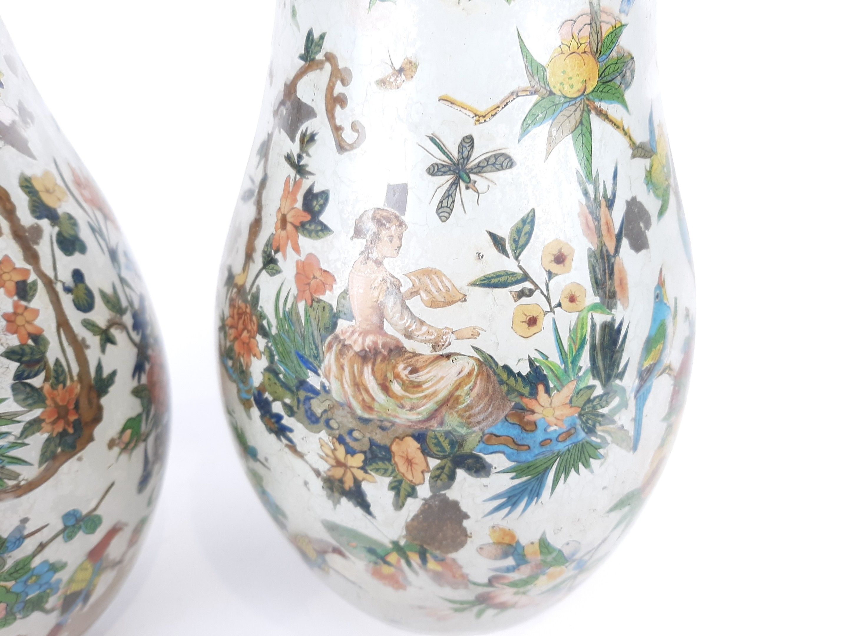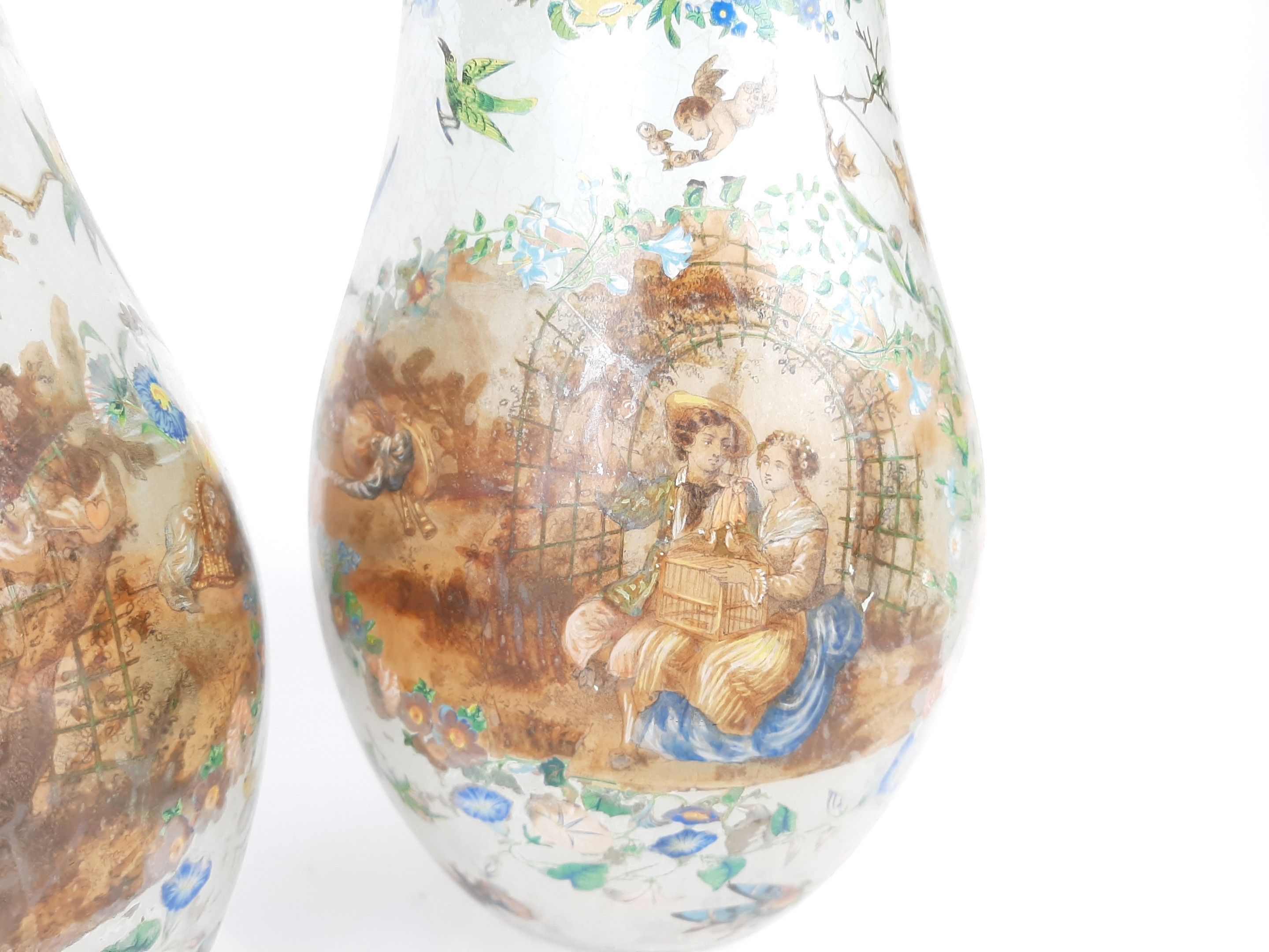 XIXème siècle ou début du XXème siècle. Paire de vases balustres en verre à décor Arte Povera de gravures animalières et végétales traitées en fixé sous verre. Hauteur : 34,5 cm. (importantes usures et décollements des fonds)