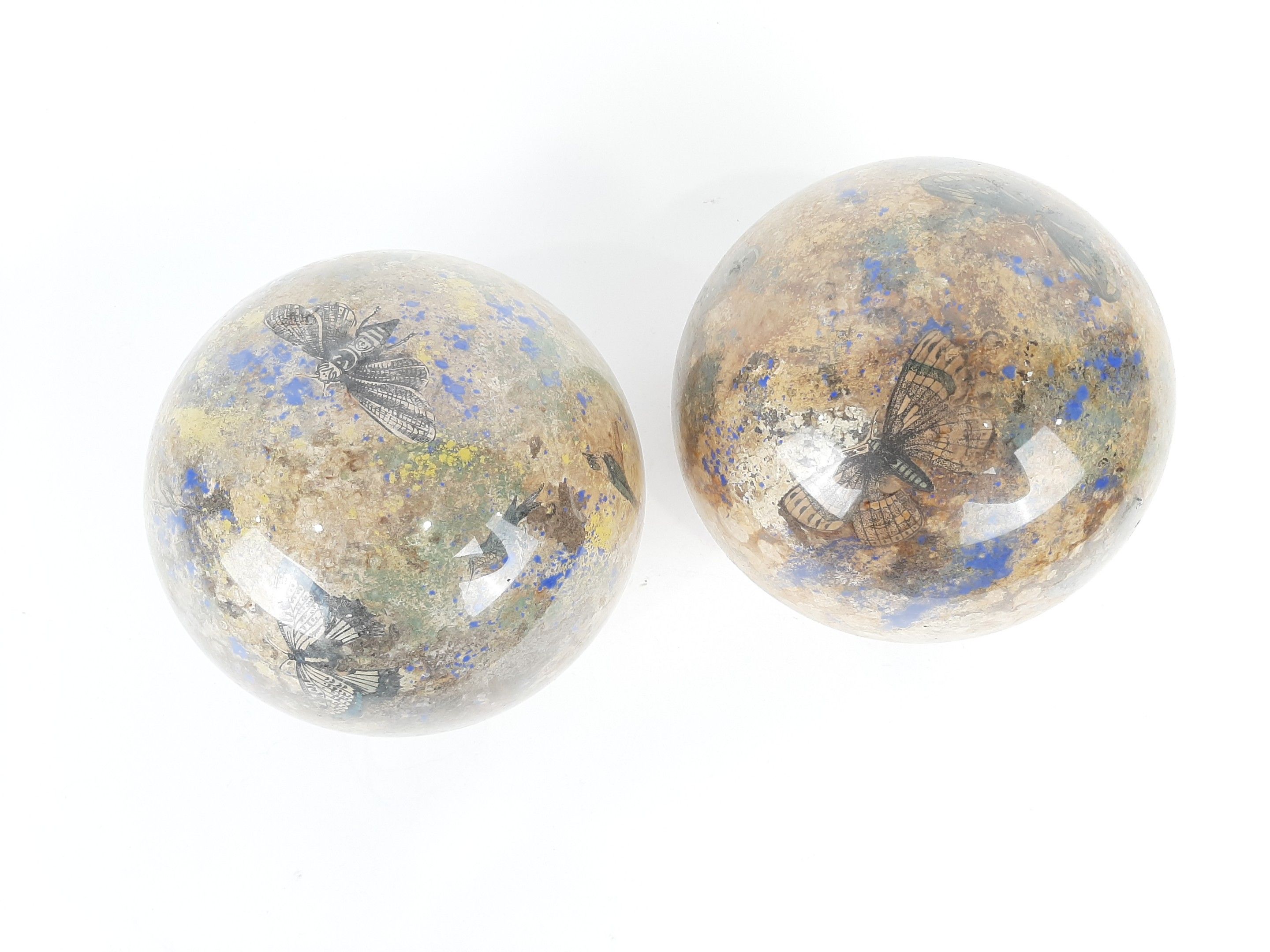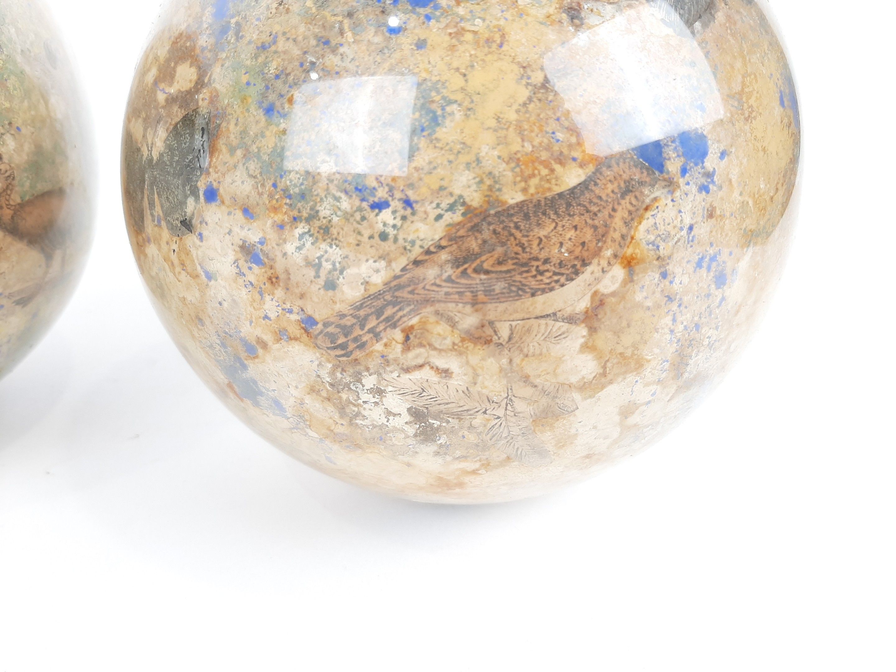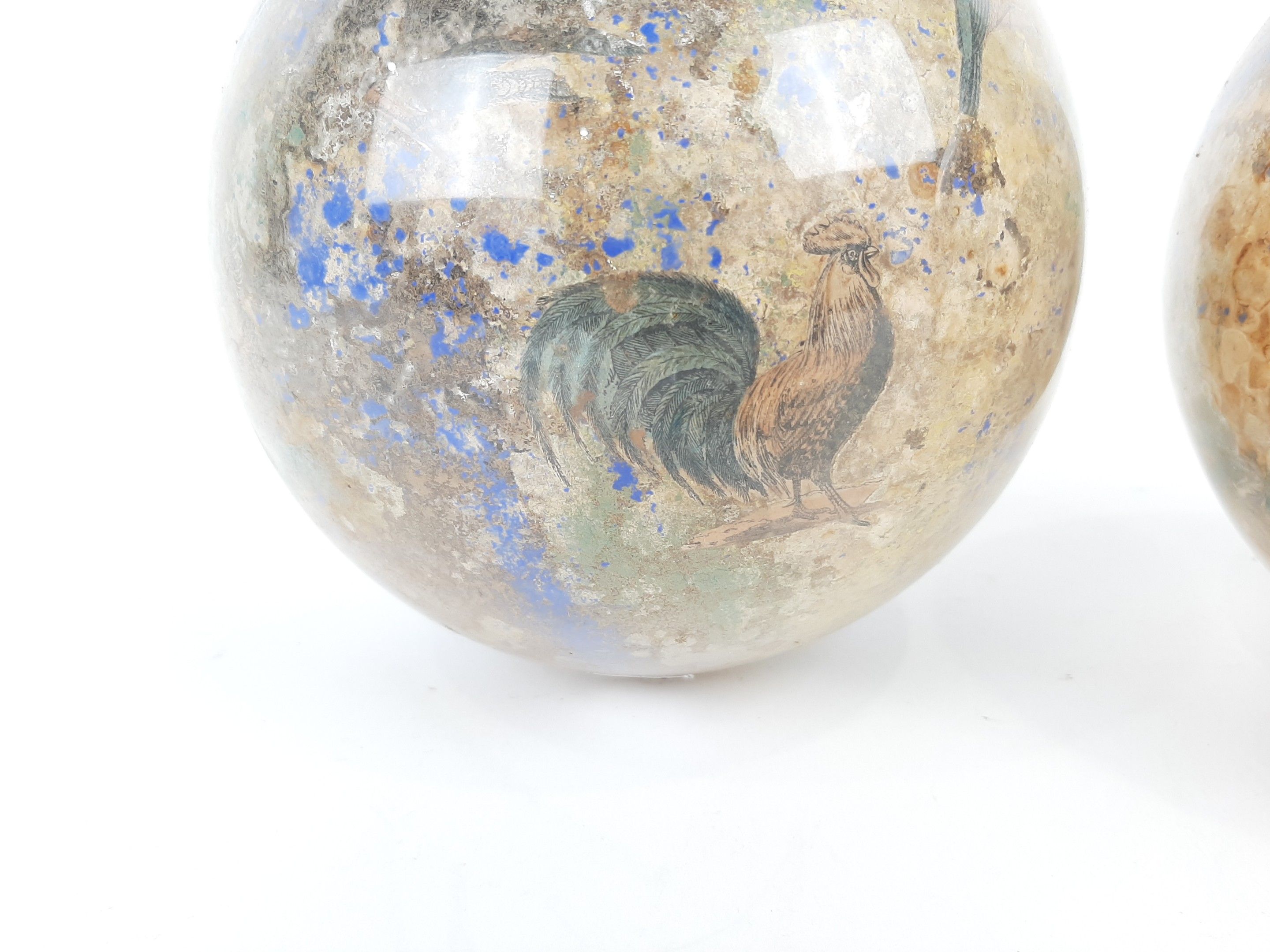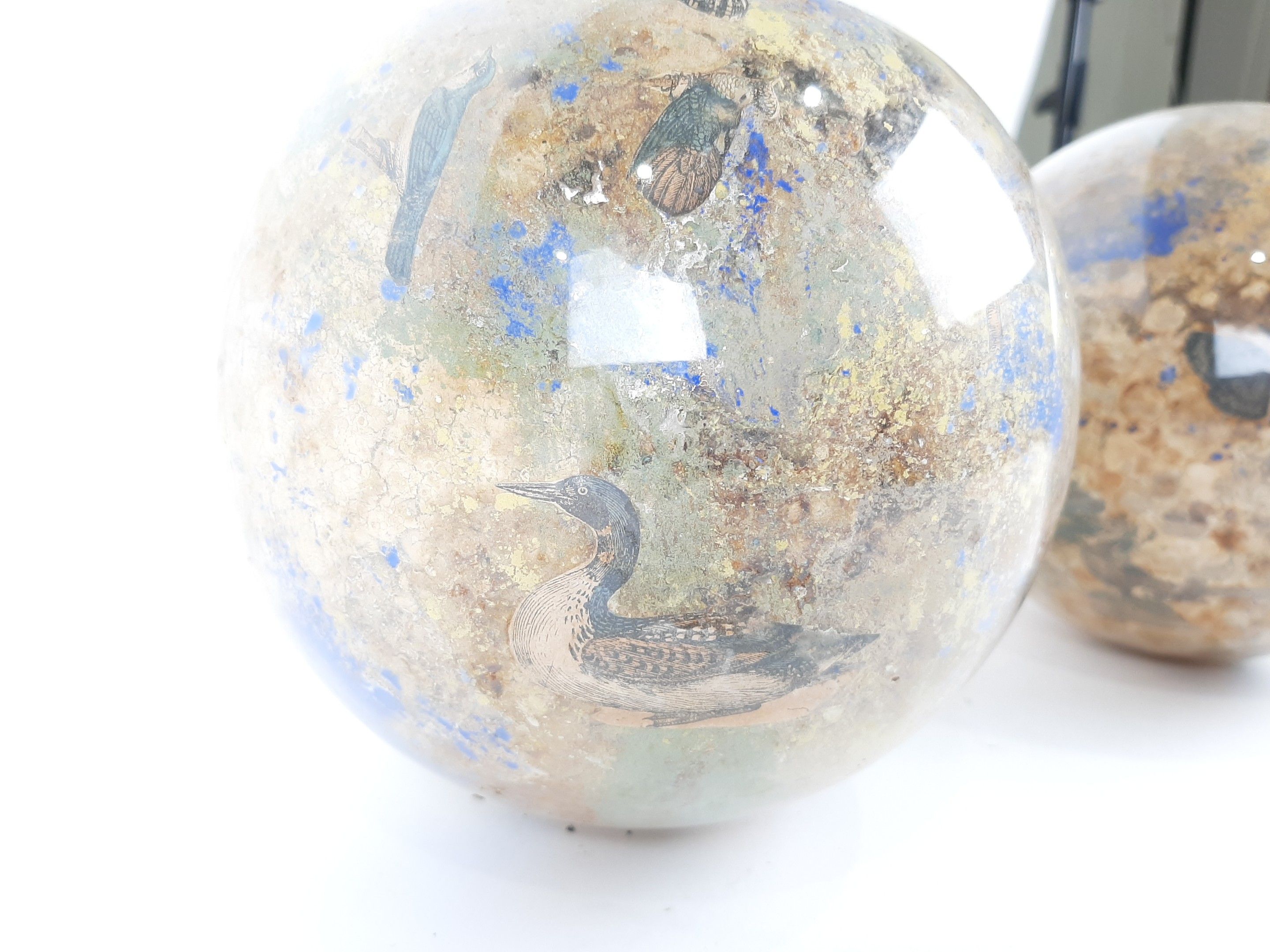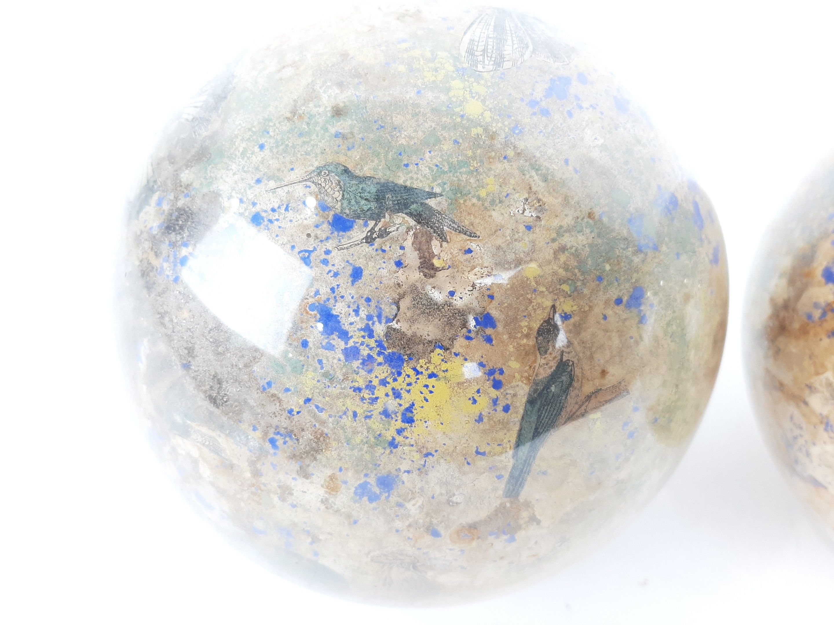 XIXème siècle ou début du XXème siècle deux globes porte perruques en verre à décor Arte Povera de gravures animalières en fixé sous verre. Diamètre : 18,5 cm environ (usures des fonds)