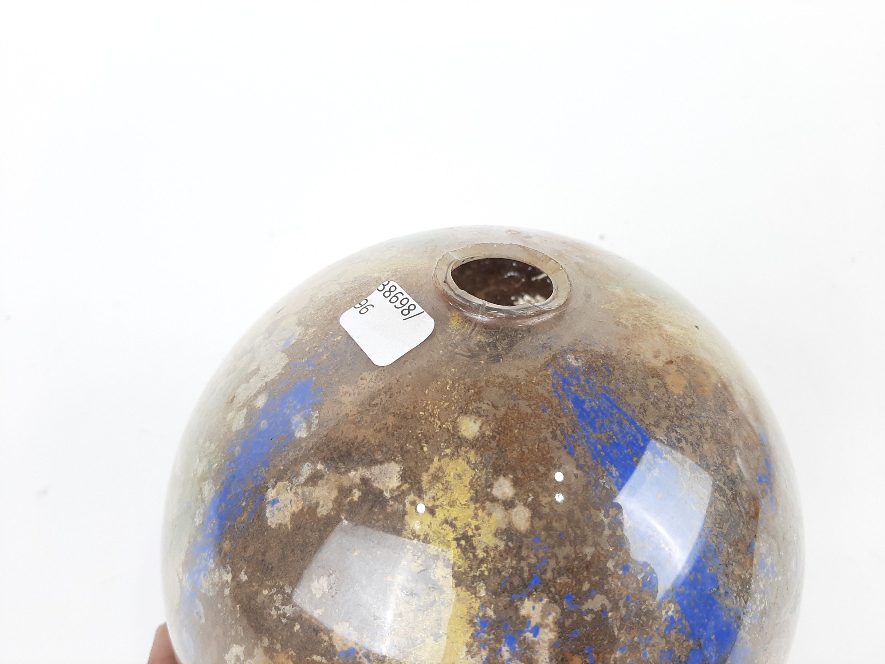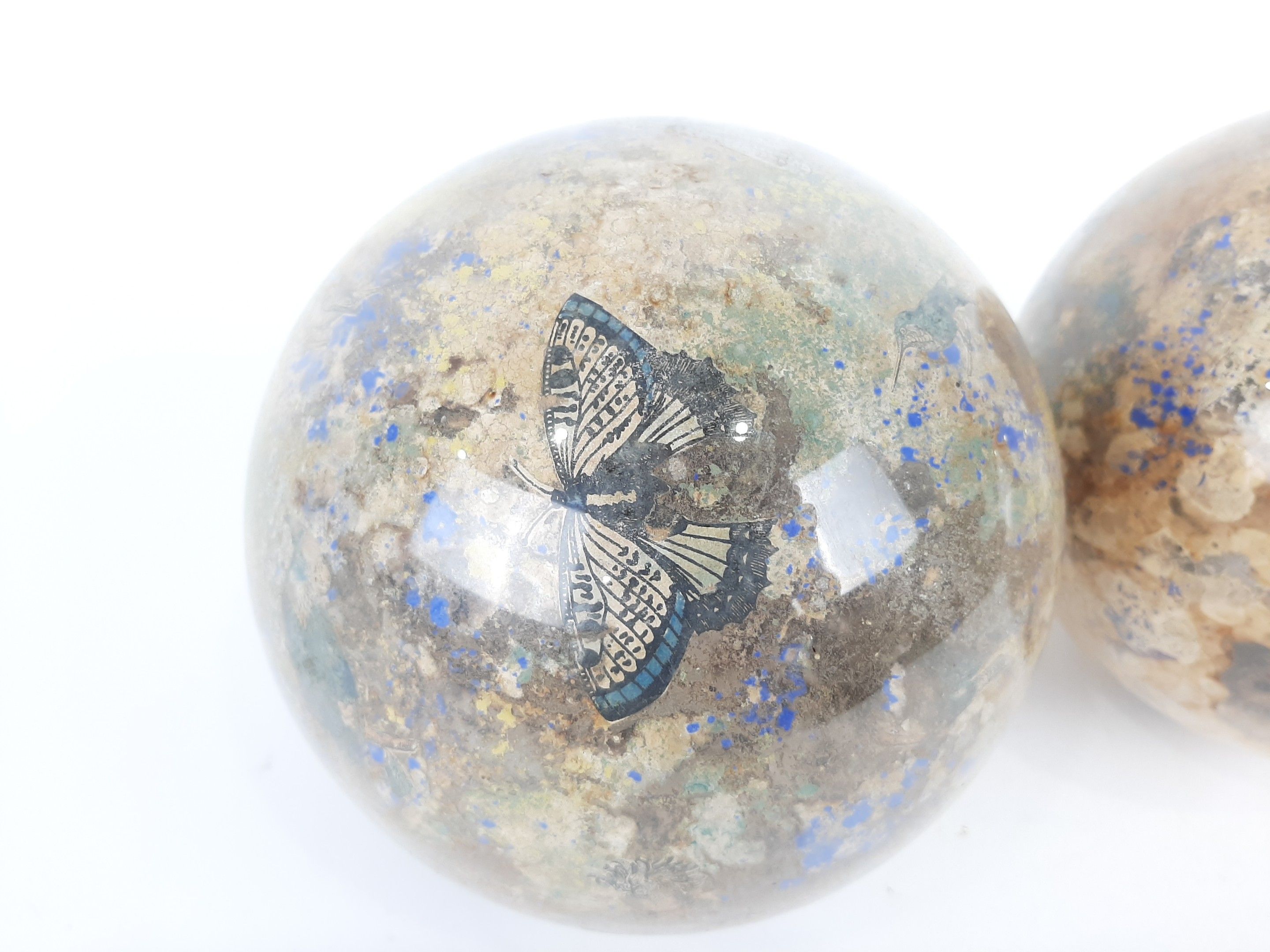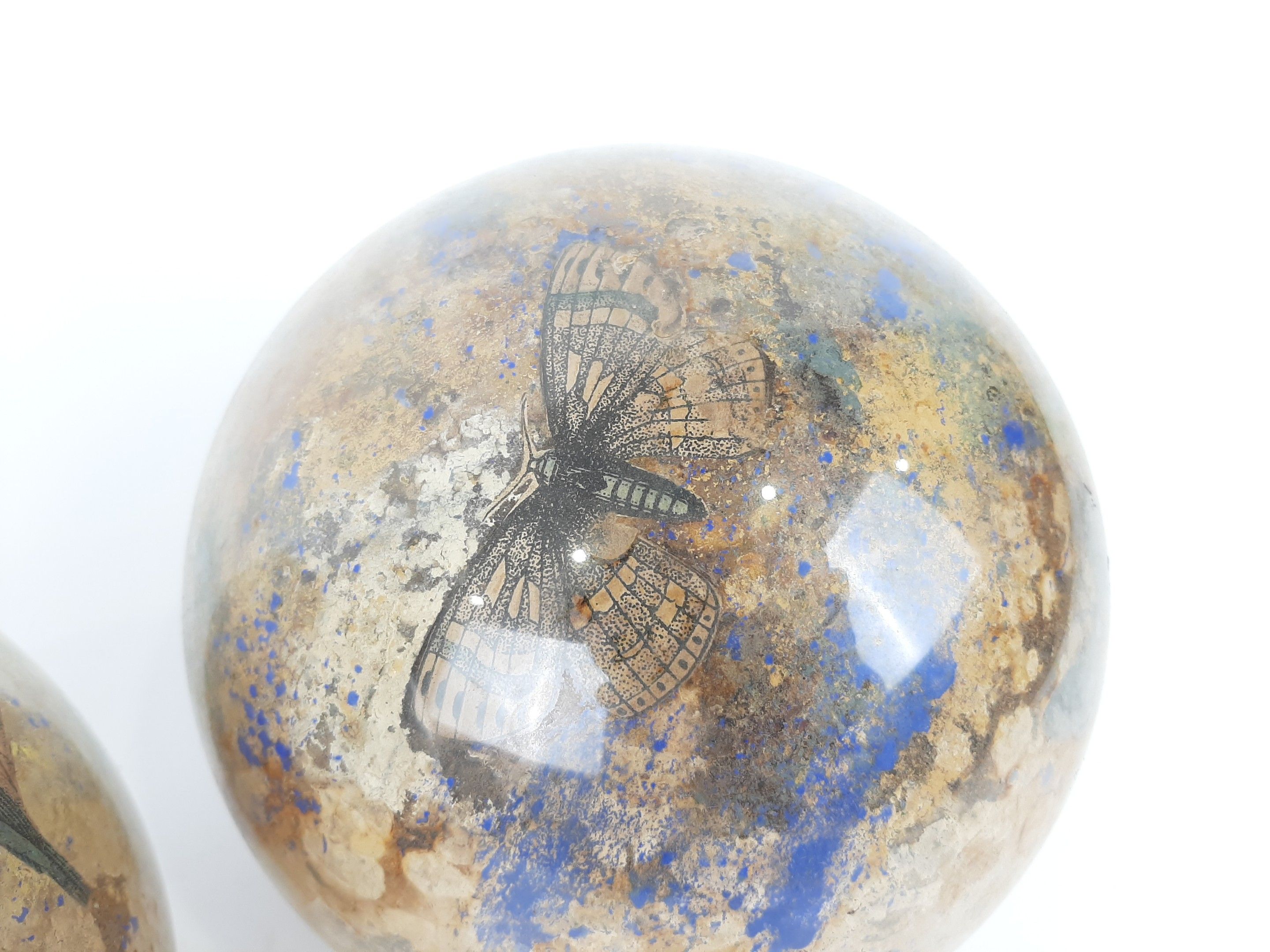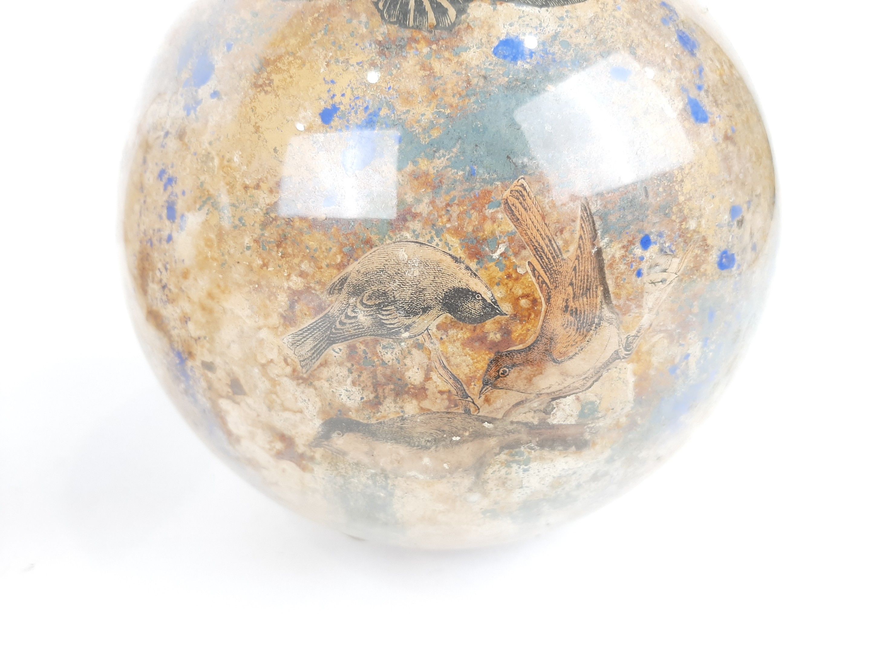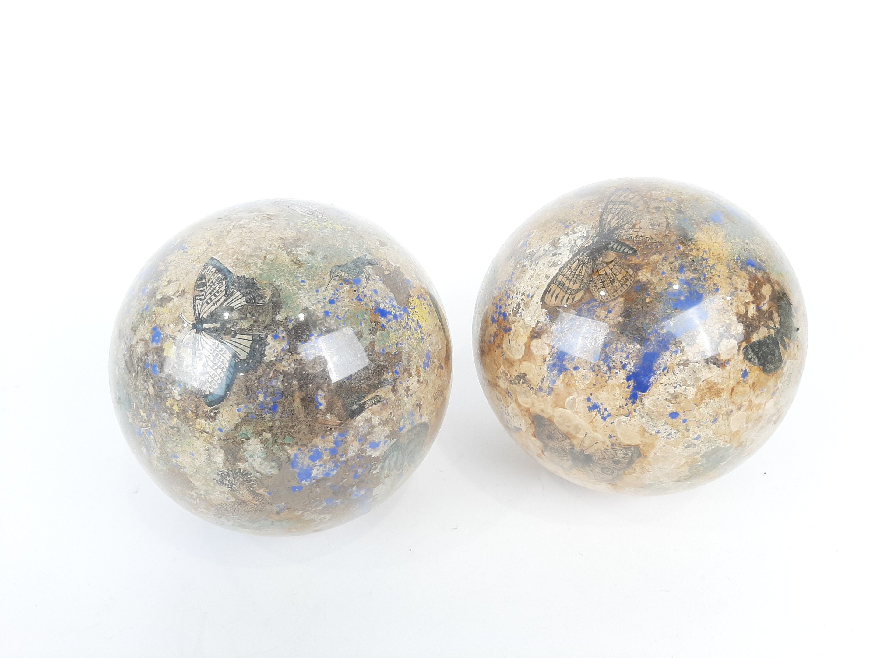 XIXème siècle ou début du XXème siècle deux globes porte perruques en verre à décor Arte Povera de gravures animalières en fixé sous verre. Diamètre : 18,5 cm environ (usures des fonds)