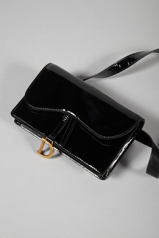 Pochette à bandoulière, modèle Saddle, amovible, en cuir verni noir, double rabat surpiqué à boucle en métal doré au D de la marque façon étrier, intérieur en suède noir, bandoulière amovible (peut se porter en pochette ou portefeuille. Fermeture zippée intérieure avec deux poches plaquées porte cartes.