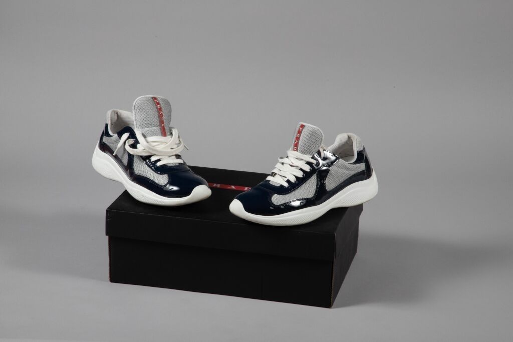 Paire de baskets en toile technique filet gris clair, à garniture de cuir vernis bleu marine, semelle blanche, lacets blancs, numérotées « 4E 3400 7 ».