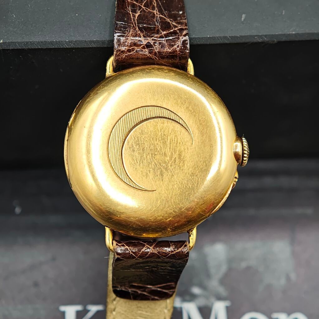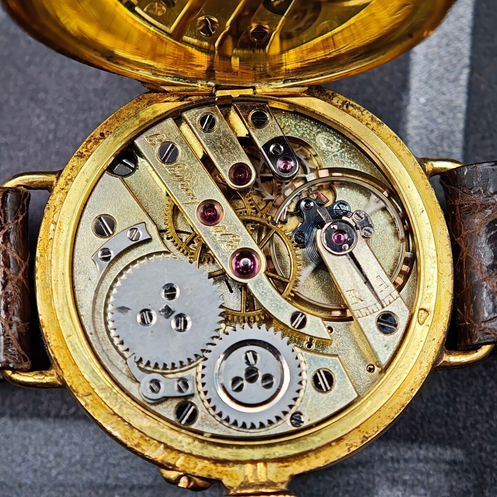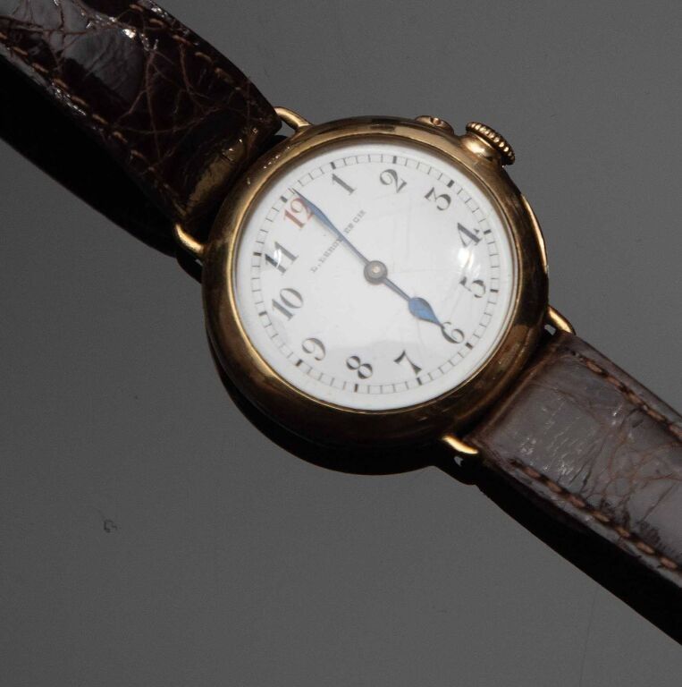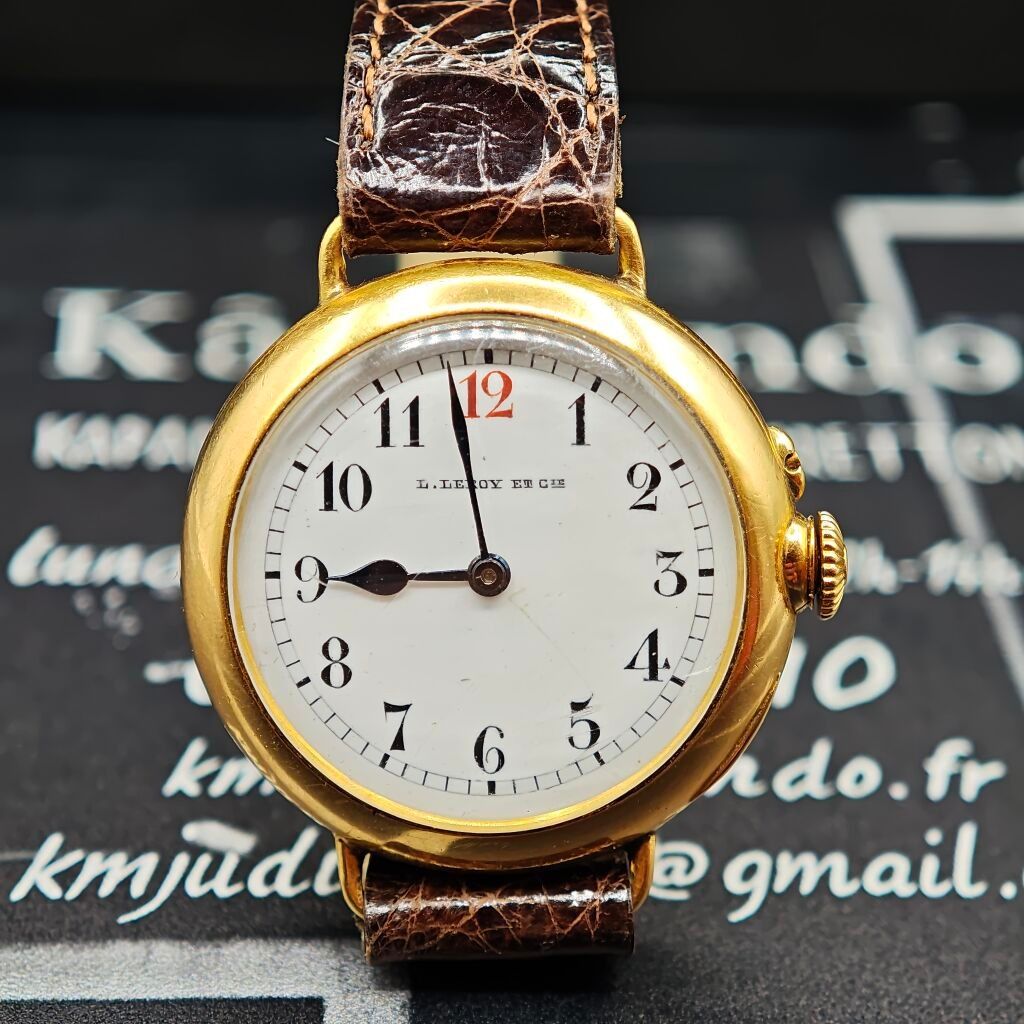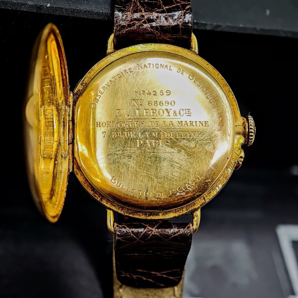 Rare CHRONOMÈTRE-BRACELET (poinçon de Besançon) en or jaune 750‰, cadran émaillé blanc (cheveu, chiffres arabes, rouge pour 12 h), index chemin de fer, aiguilles poires en acier bleui, fond clipsé à charnière, gravé d'un croissant de lune rainuré, cuvette gravée « Observatoire National de Besançon, n°4259, n°68690, L. Leroy & Cie, Horlogers de la marine, 7 bd de la Madeleine, Paris », mouvement signé, échappement à ancre suisse.