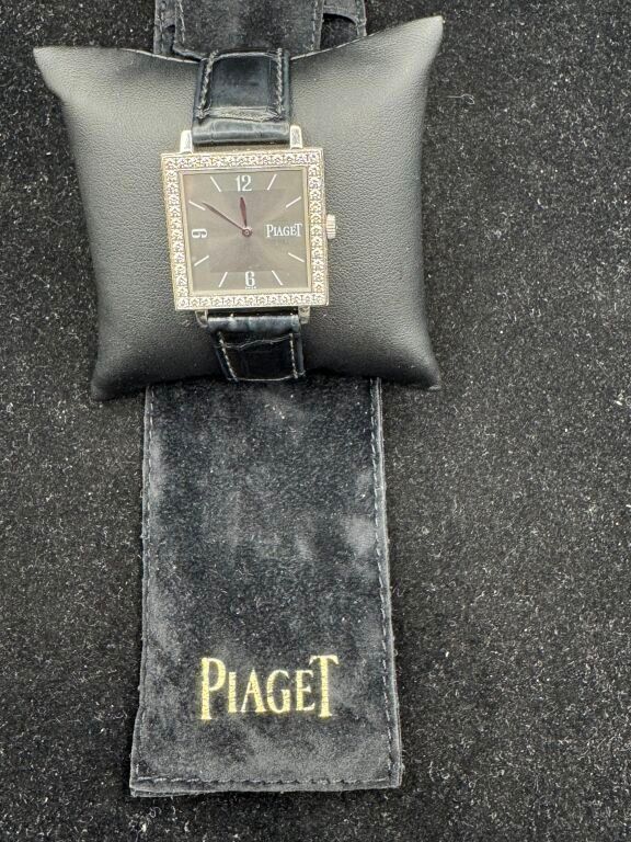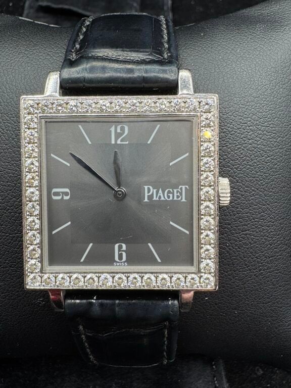 MONTRE-BRACELET d'homme en or blanc 750‰, boîte de forme carrée, la lunette entièrement sertie de diamants. Cadran anthracite à décor rayonnant et effet soyeux au centre, signé à 3h, index bâtons et chiffres arabes aux cardinaux, aiguilles glaives, mouvement à quartz non ouvert.