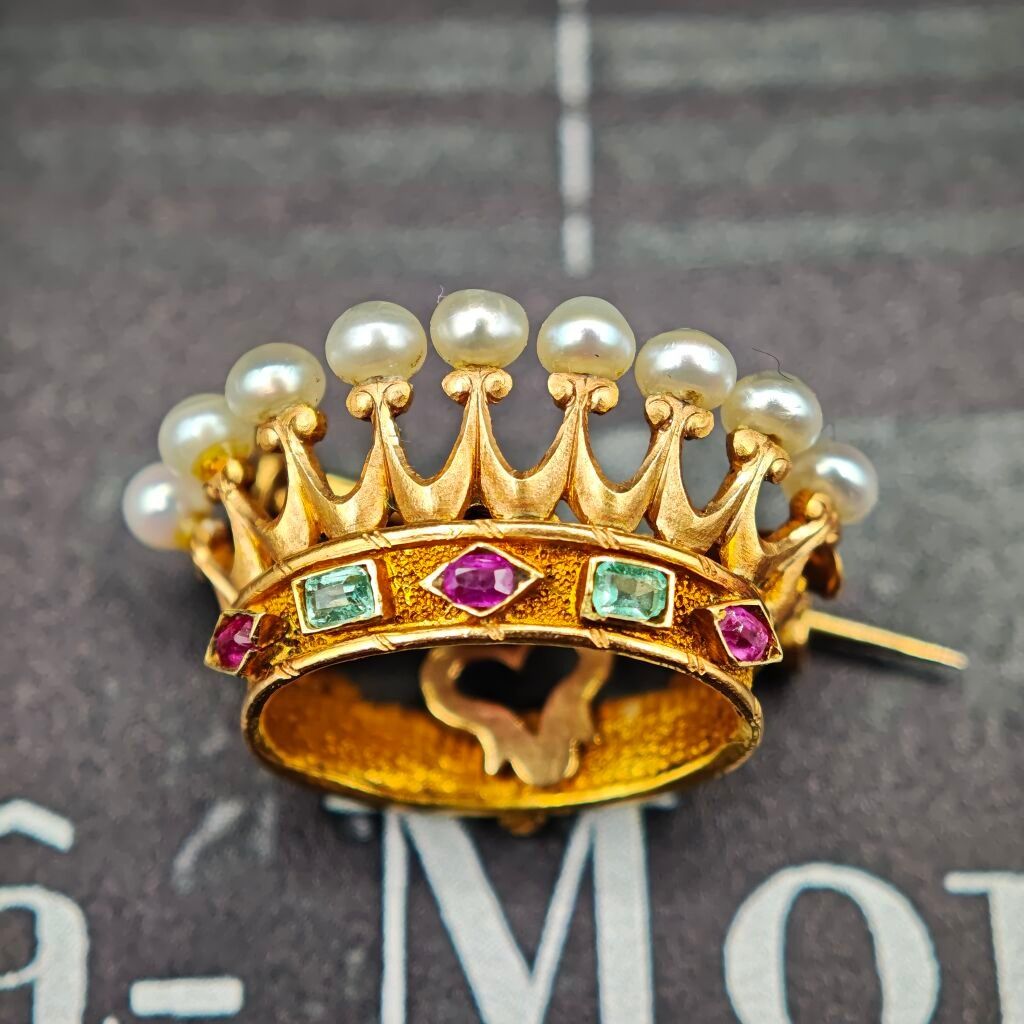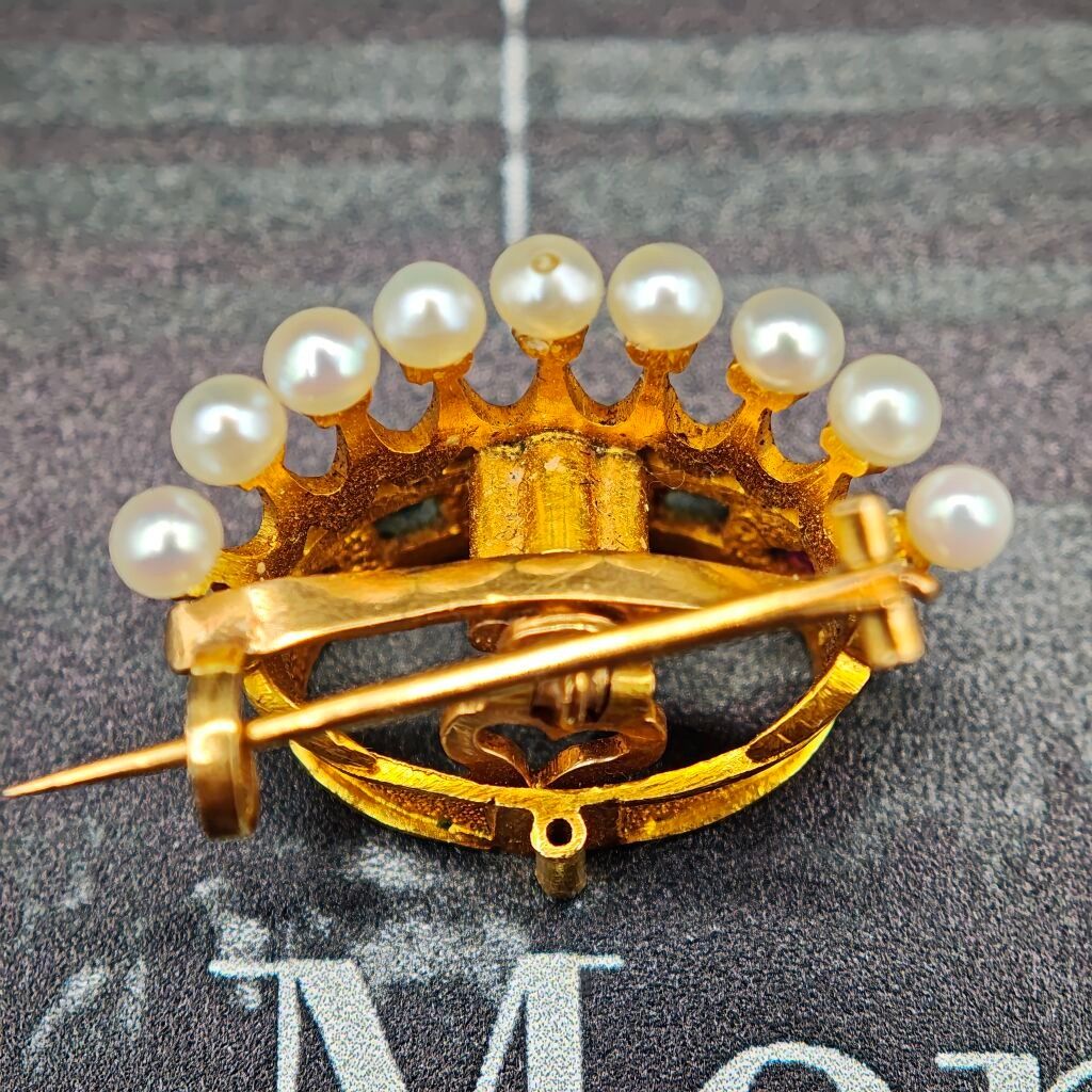 BROCHE présentant une couronne comtale en or jaune 750‰, les fleurs stylisées de perles fines, serties d'émeraudes et de rubis de taille ancienne alternés.