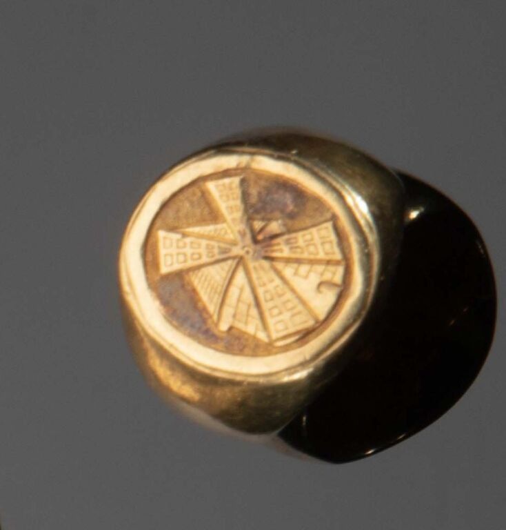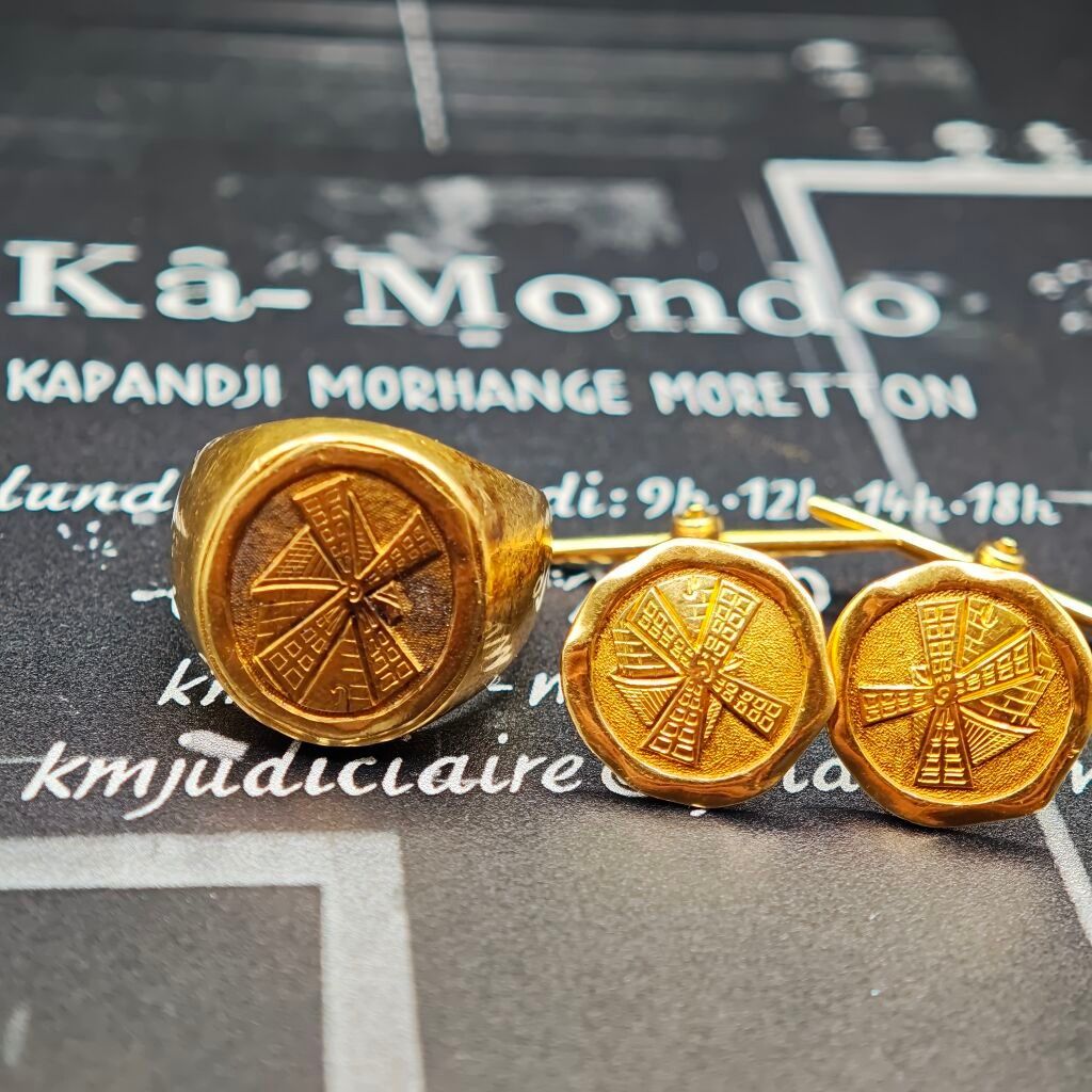 Ensemble en or jaune 750‰ sur le thème de la minoterie, constitué d'une BAGUE de type chevalière et d'une paire de BOUTONS DE MANCHETTES, partiellement martelés et ciselés d'un décor de moulins sur fond texturé.