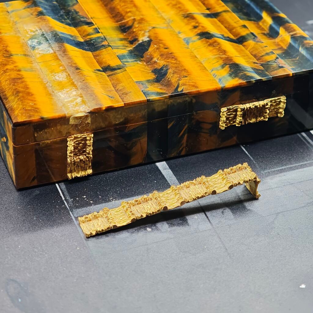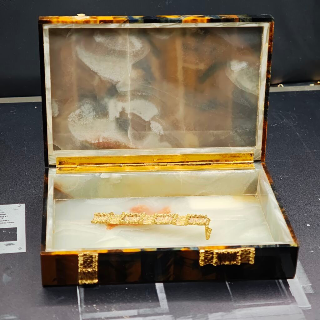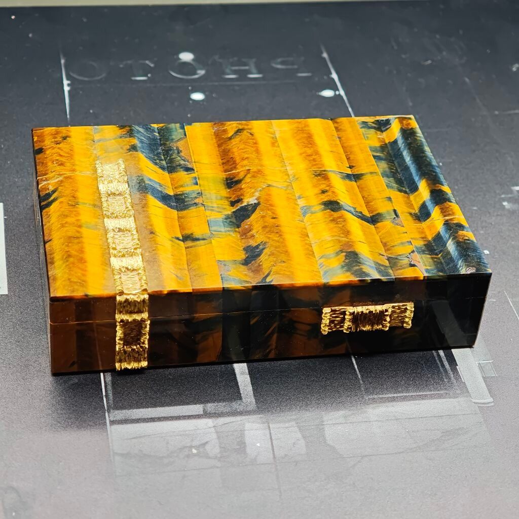 BOITE en agate œil-de-tigre et agate claire, les prises décoratives en or jaune 750‰. Charnière en argent doré 800‰ (décor à recoller).
