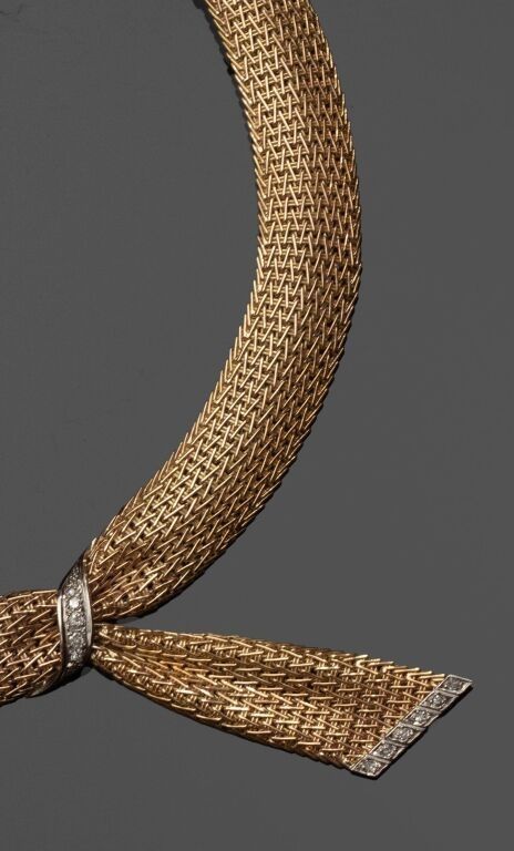 COLLIER cravate passementerie en or 750‰ et platine 950‰, orné de deux liens sertis de diamants de taille ancienne et de taille huit-huit.