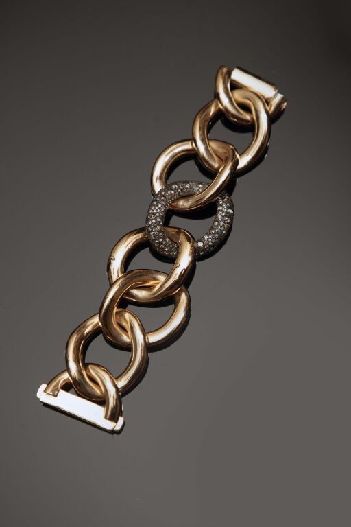 BRACELET articulé en or rose 750‰ composé d'un tour de poignet à mailles gourmettes massives, dont une sertie sur la face visible de diamants brillantés et taillés en rose sur fond en argent 925‰ noirci. Fermoir ressort à guides signé. Dans son écrin et sa boîte.