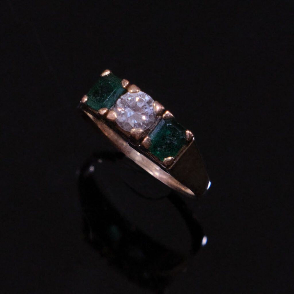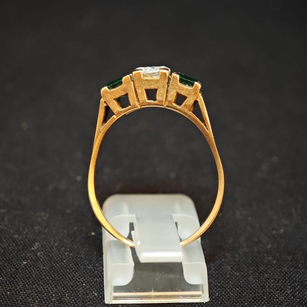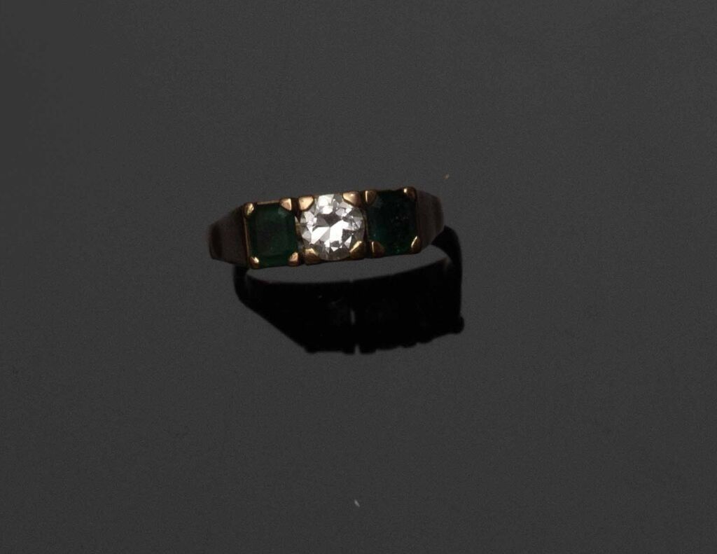 BAGUE trilogie en or jaune 750‰ ornée d'un diamant demi-taille (culasse fermée) pesant environ 0,70 ct entre deux émeraudes de taille émeraude (égrisures, usures).