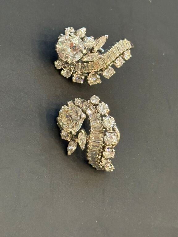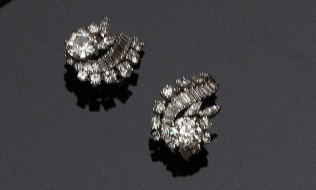 PAIRE DE CLIPS D'OREILLES percés en or blanc 750‰, chacun serti d'un diamant de taille ancienne pesant environ 1,75 ct (soit 3,50 cts au total env.) dans des motifs volutes sertis de diamants de taille baguette et brillantés.