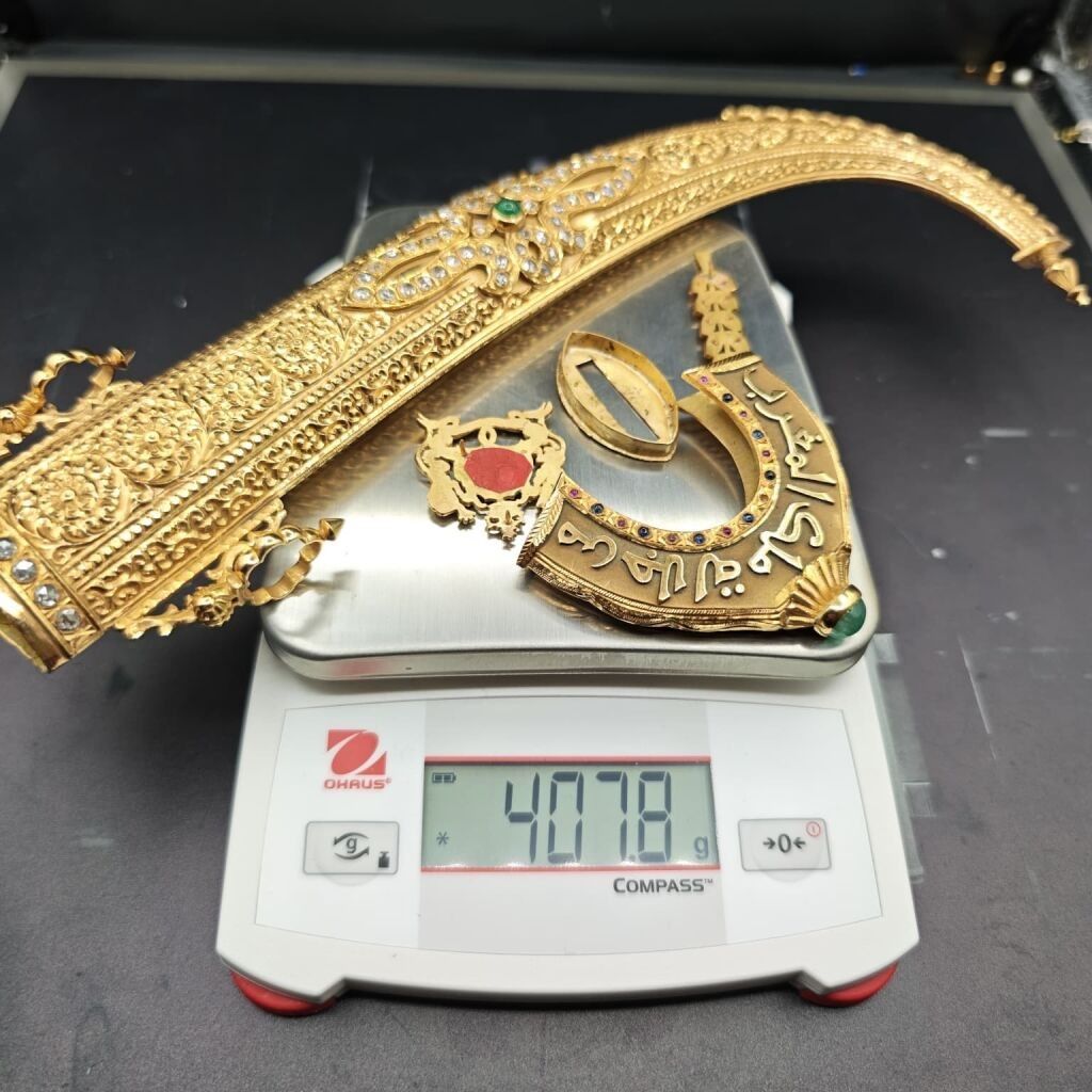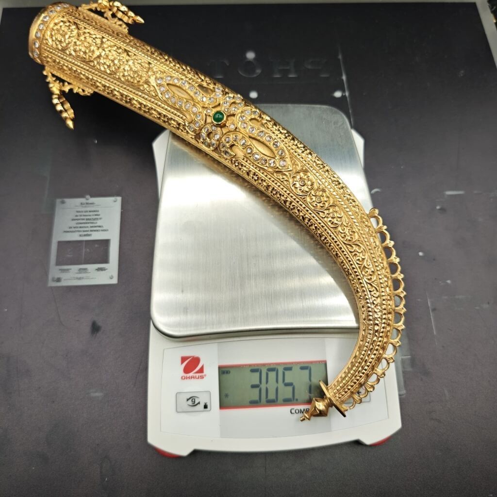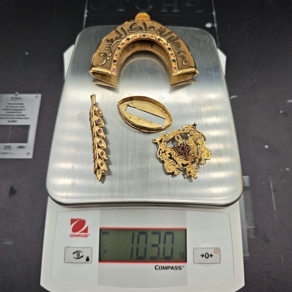 Poignard KOUMYA 1972. Cadeau royal de la part du Roi du Maroc Hassan II, poignard en or 750‰, le fourreau orné de motifs sertis de diamants taillés en rose au centre un cabochon d'émeraude pesant environ 2,20 cts, ainsi qu'un motif ceinture sur la partie haute. Le manche est garni d'une pièce en or ciselé orné de petits saphirs et petits rubis cabochons (manque) et sommé d'une émeraude cabochon en serti clos pesant environ 3,50 cts (ainsi que la partie en or sur la garde) et d'un motif en blason et d'une branche de laurier sertie de petits rubis cabochons. La lame en acier à décor émaillé porte l'inscription en arabe « De la part de sa majesté le Roi du Maroc ».