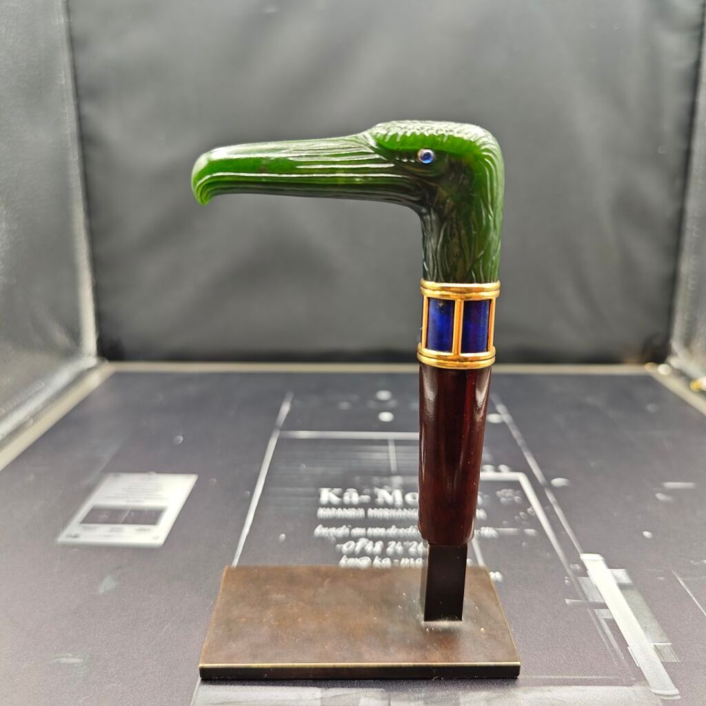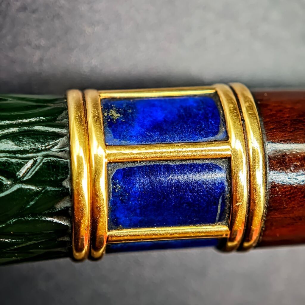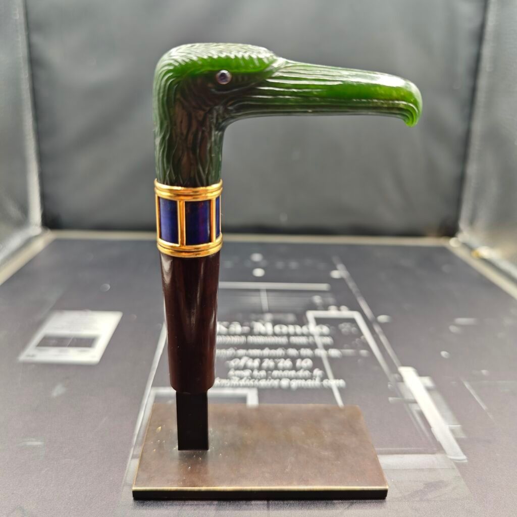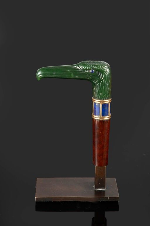 POMMEAU DE CANNE présentant une tête d'aigle de type « egyptian revival » stylisée en jade-néphrite, les yeux en cabochons de saphirs en serti clos argent, le cou stylisé d'un décor de col à deux doubles godrons et plaques de lapis-lazuli. Corps en bois atrocement coupé et soclé.
