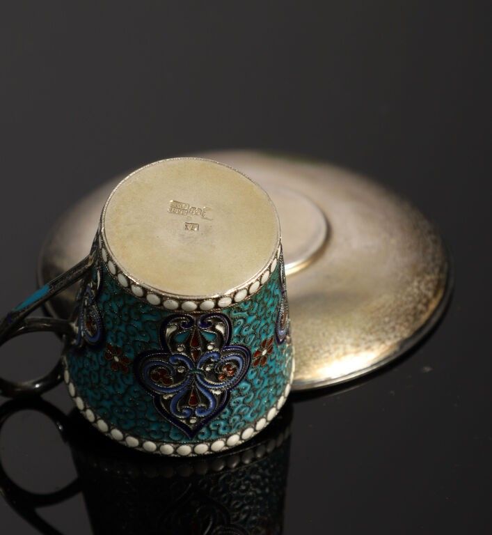 Tasse mignonnette et sa sous-tasse en argent (84 zolotniks - 875/1 000e) à décor en émail cloisonné polychrome de motifs lancéolés sur fond turquoise à motifs de spirales.