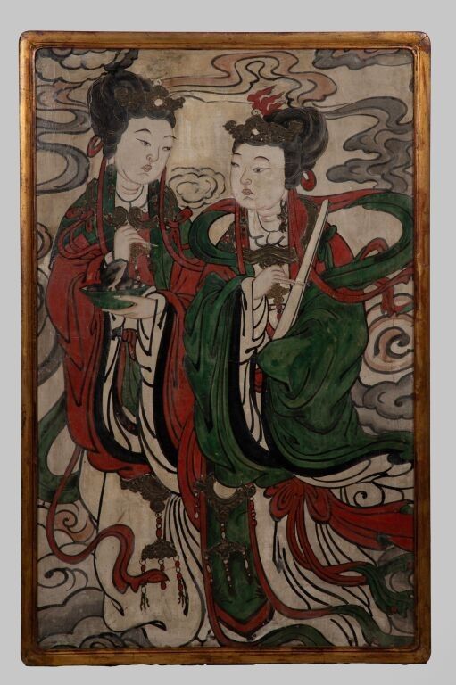Fragment de fresque en stuc en forme de panneau rectangulaire, à décor polychrome de deux immortelles féminines vêtues de longues robes, l'une tenant une tablette hu et l'autre une coupe à offrandes.