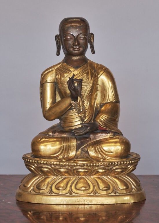 Statuette de luohan en cuivre repoussé et doré représenté assis en padmasana sur une double base lotiforme, la main droite en vitarkamudra, la main gauche en dhyanamudra, vêtu d'une robe monastique, le visage serein, les yeux mi-clos.