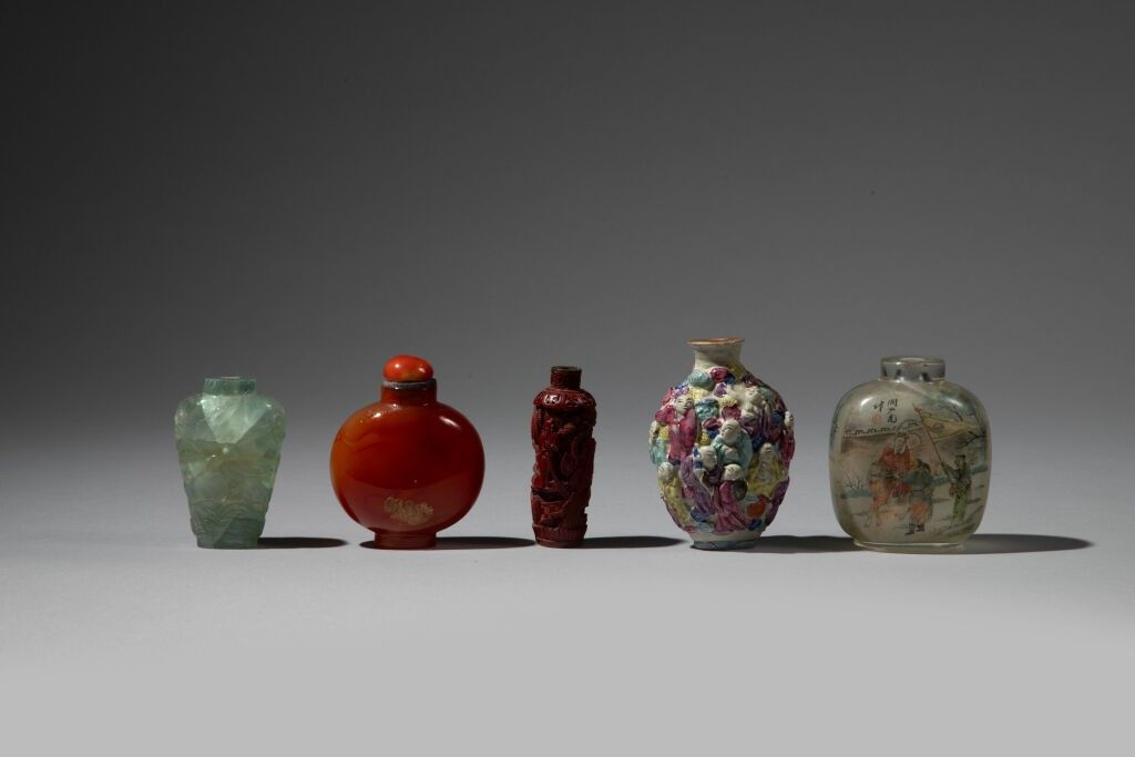 Ensemble de six tabatières en porcelaine, agate, quartz vert, verre peint à l'intérieur et laque rouge, dont certaines à décor de scènes animées de personnages et dragon pourchassant la perle sacrée.