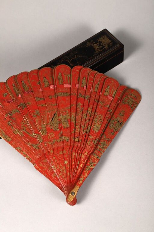 Éventail en bois à décor or sur fond laqué rouge de personna…