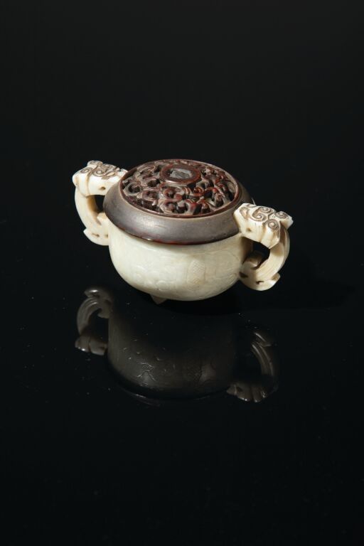 Petit brûle-parfum Gui en jade, reposant sur trois petits pieds à décor de motifs archaïsants, les anses en forme de dragon.