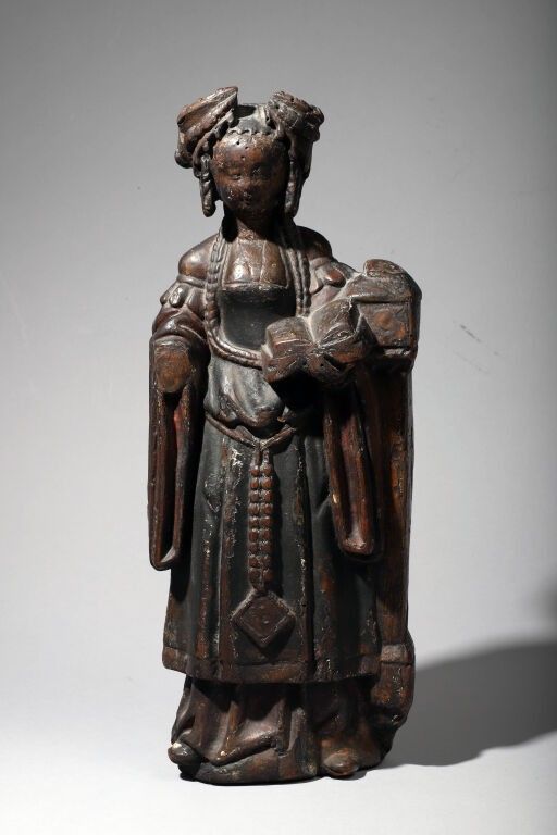 Sainte Barbe en noyer sculpté, polychromé et doré. Debout, la tour à ses côtés, la sainte tient un livre ouvert de sa main gauche ; chevelure retenue dans un turban laissant échapper deux longues tresses qui reviennent sur le devant de la poitrine. Pal au dos.