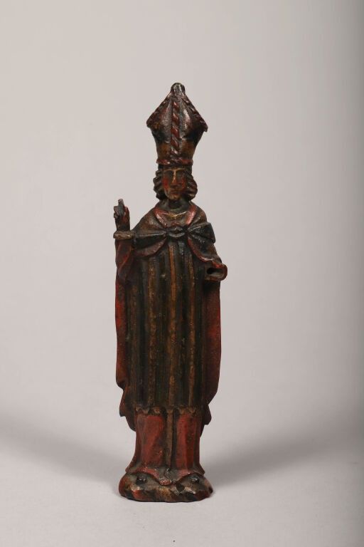 Saint Evêque bénissant en bois sculpté et polychromé.