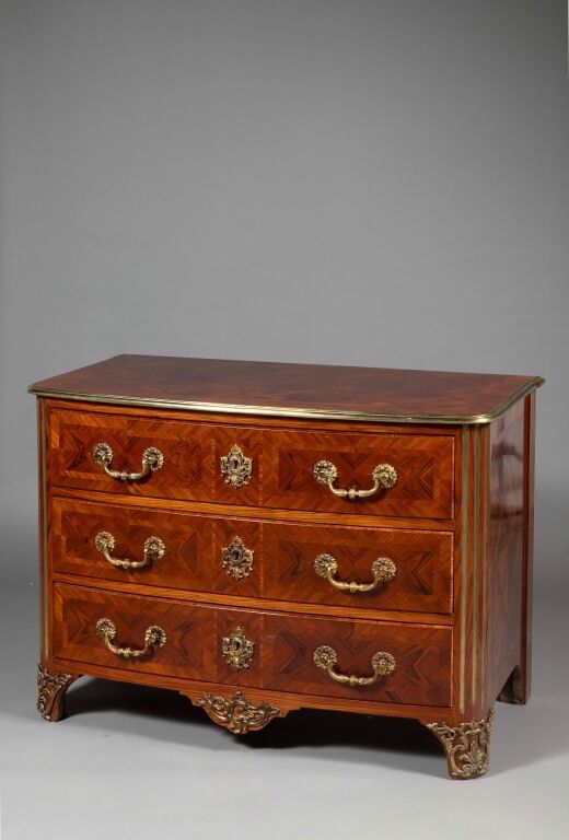 Commode de forme cintrée en placage de bois de violette disposé en frisage dans des encadrements de filets, ouvrant par trois tiroirs sur trois rangs séparés par des traverses. Plateau à décor plaqué en ailes de papillons. Montants droits à cannelures foncées de cuivre. Ornements en bronze verni.