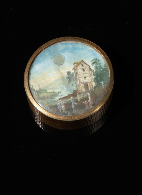 Boîte ronde en pomponne doré à fond guilloché, le couvercle orné d'une miniature illustrant une montgolfière en vol parmi les nuages.