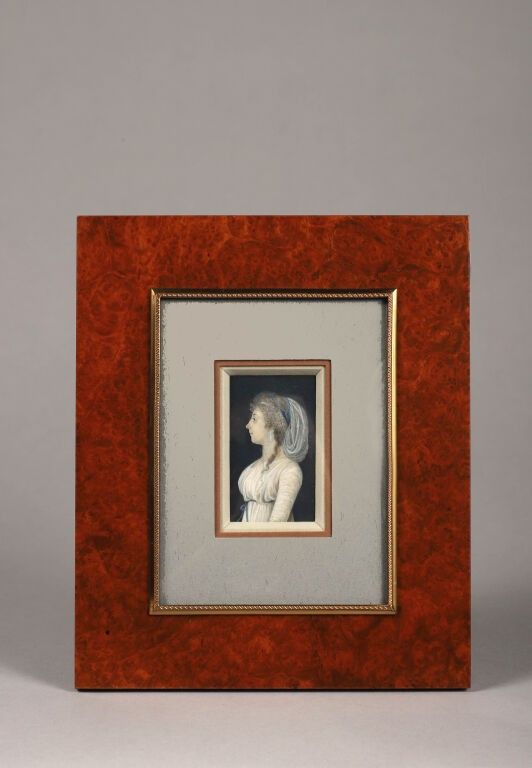 Portrait en buste de profil d'une jeune femme à la robe blanche sur fond bleu.