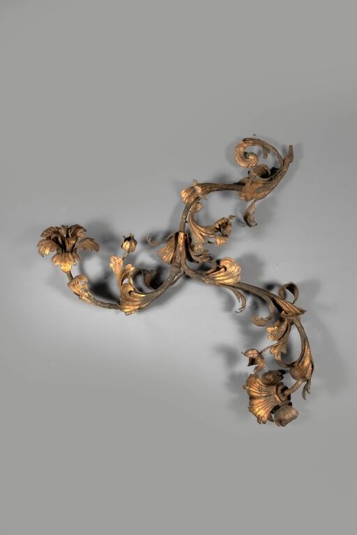 Élément d'enseigne en fer forgé, tôle découpée et dorée à décor de feuilles d'acanthes déchiquetées, fleurs épanouies et bourgeonnantes.