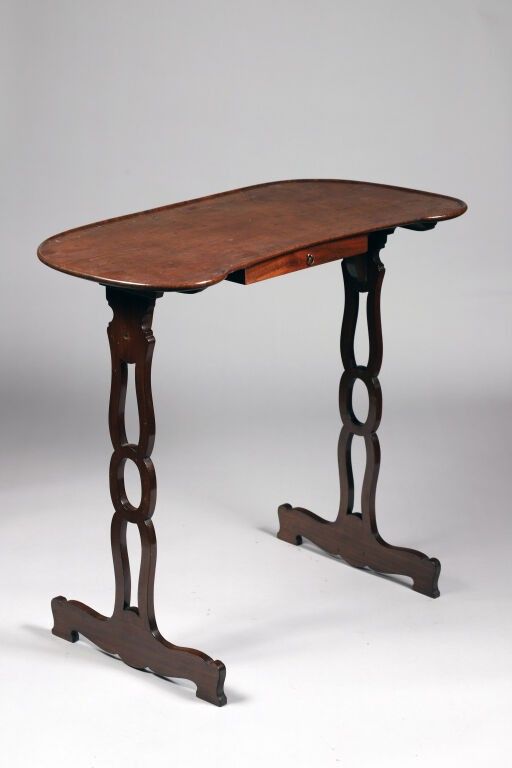 Petite table haricot en acajou ouvrant par un petit tiroir en ceinture, les montants ajourés.
