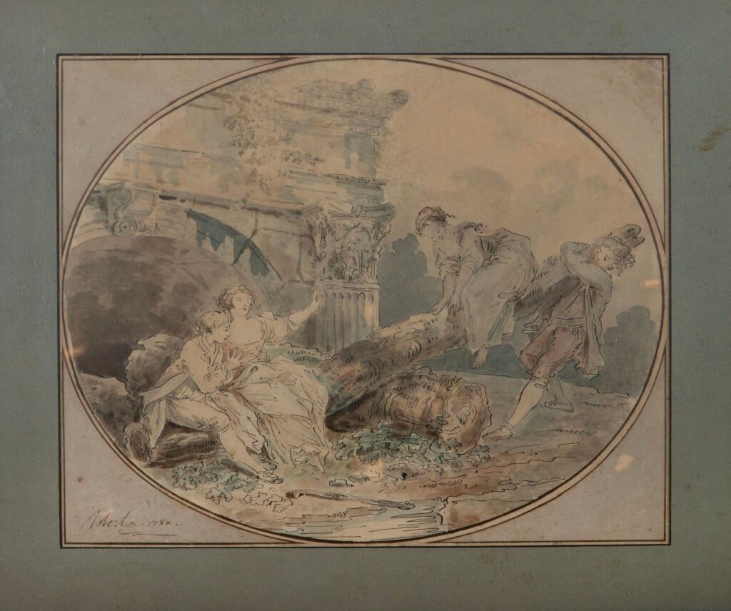 École de Hubert ROBERT. Jeux galant dans un parc « La balanc…
