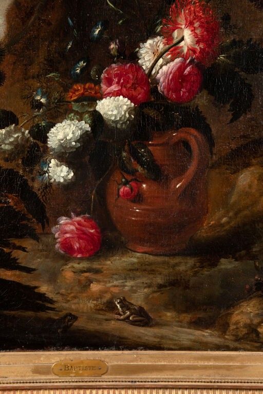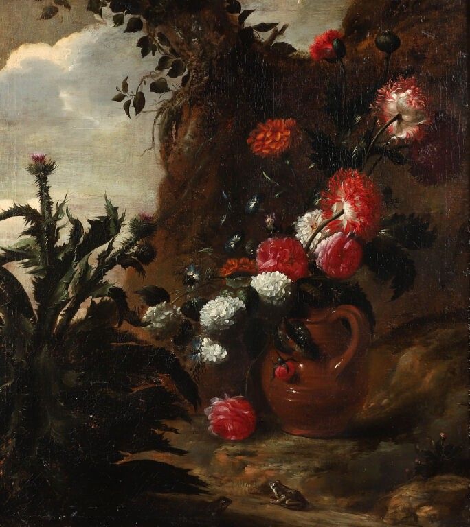Fleurs coupés dans une cruche dans un paysage avec un chardon et des grenouilles.
