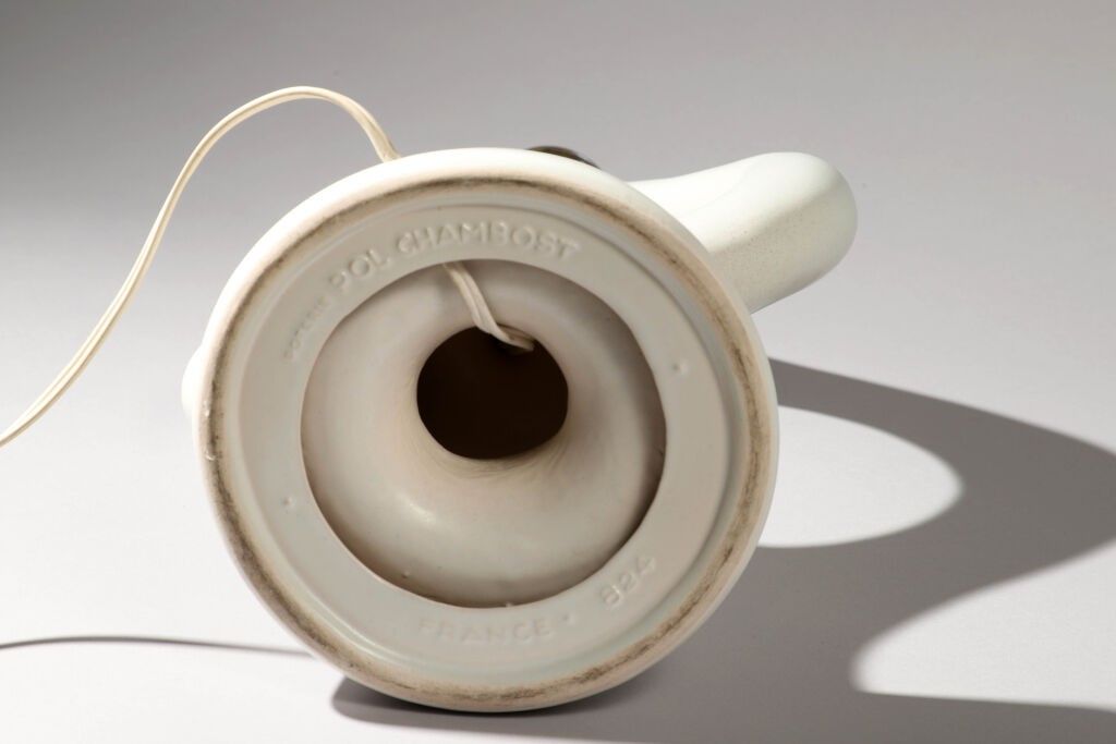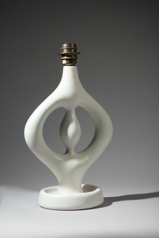 Pied de lampe anthropomorphe en céramique émaillée blanche à corps évidé et base circulaire en bassin.