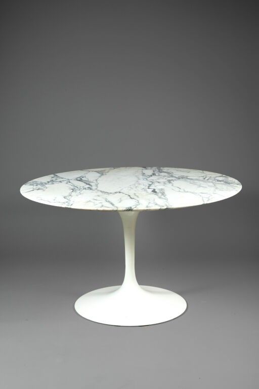 Table de salle à manger modèle 173 à plateau circulaire en marbre blanc veiné sur un piétement tulipe en fonte d'aluminium laqué blanc.