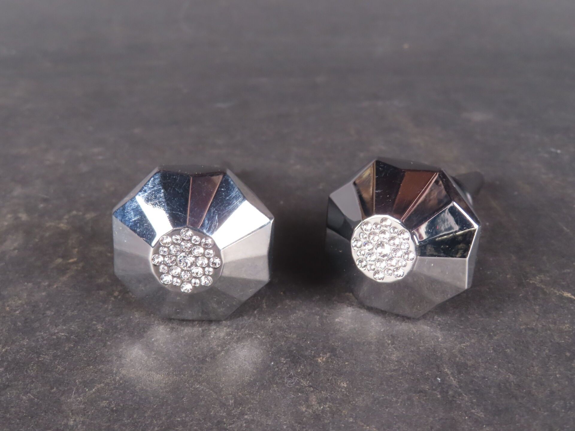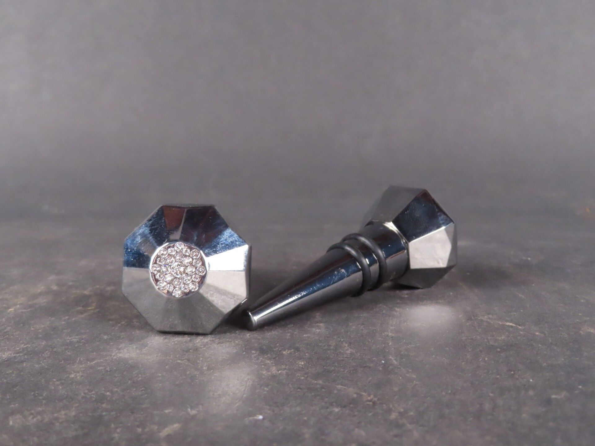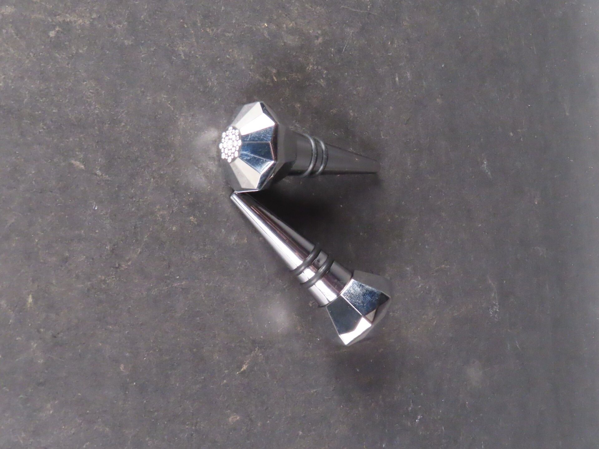 SWAROWSKI. Paire de bouchons de carafe en métal argenté, ornés de strass, signés