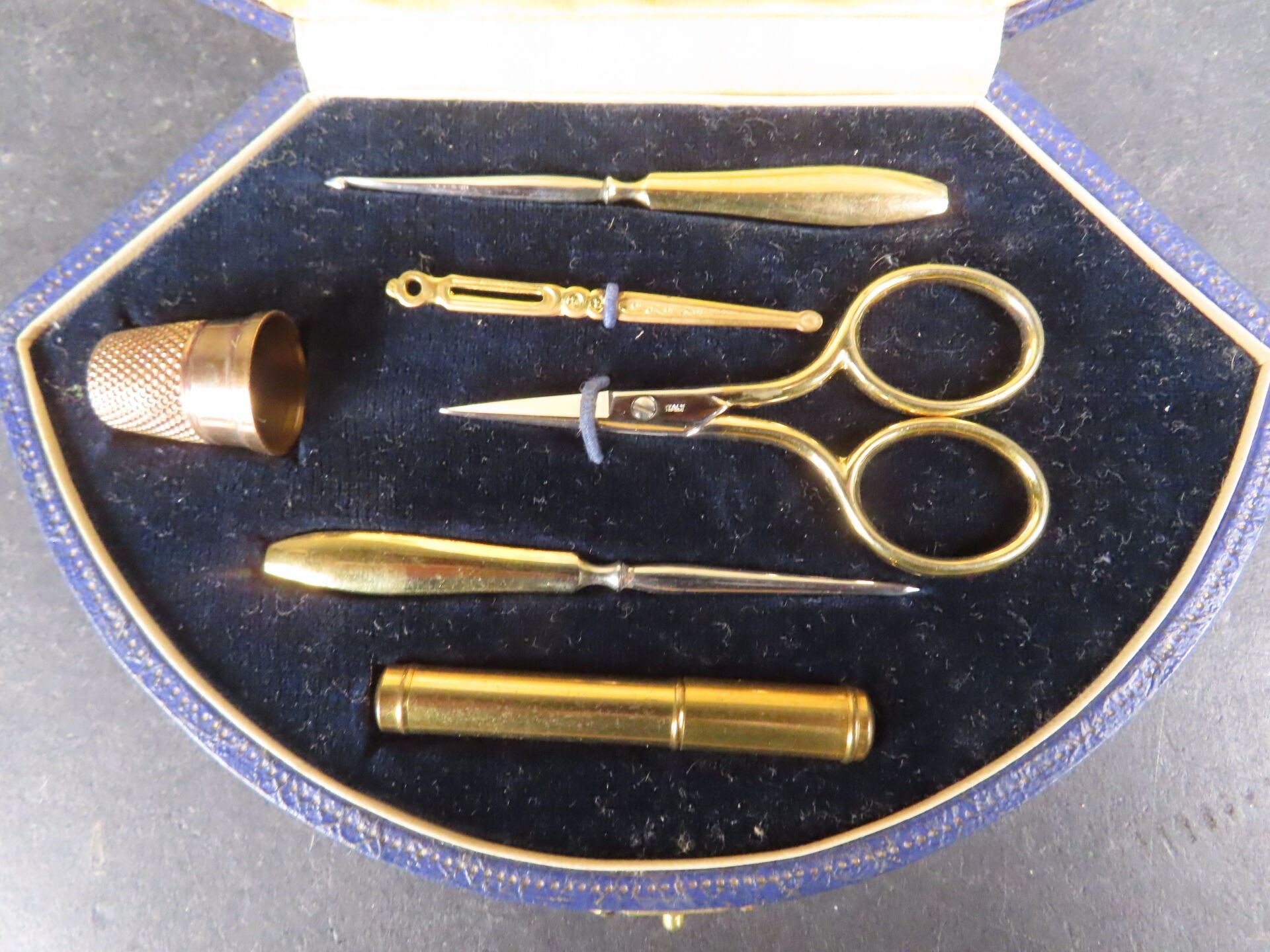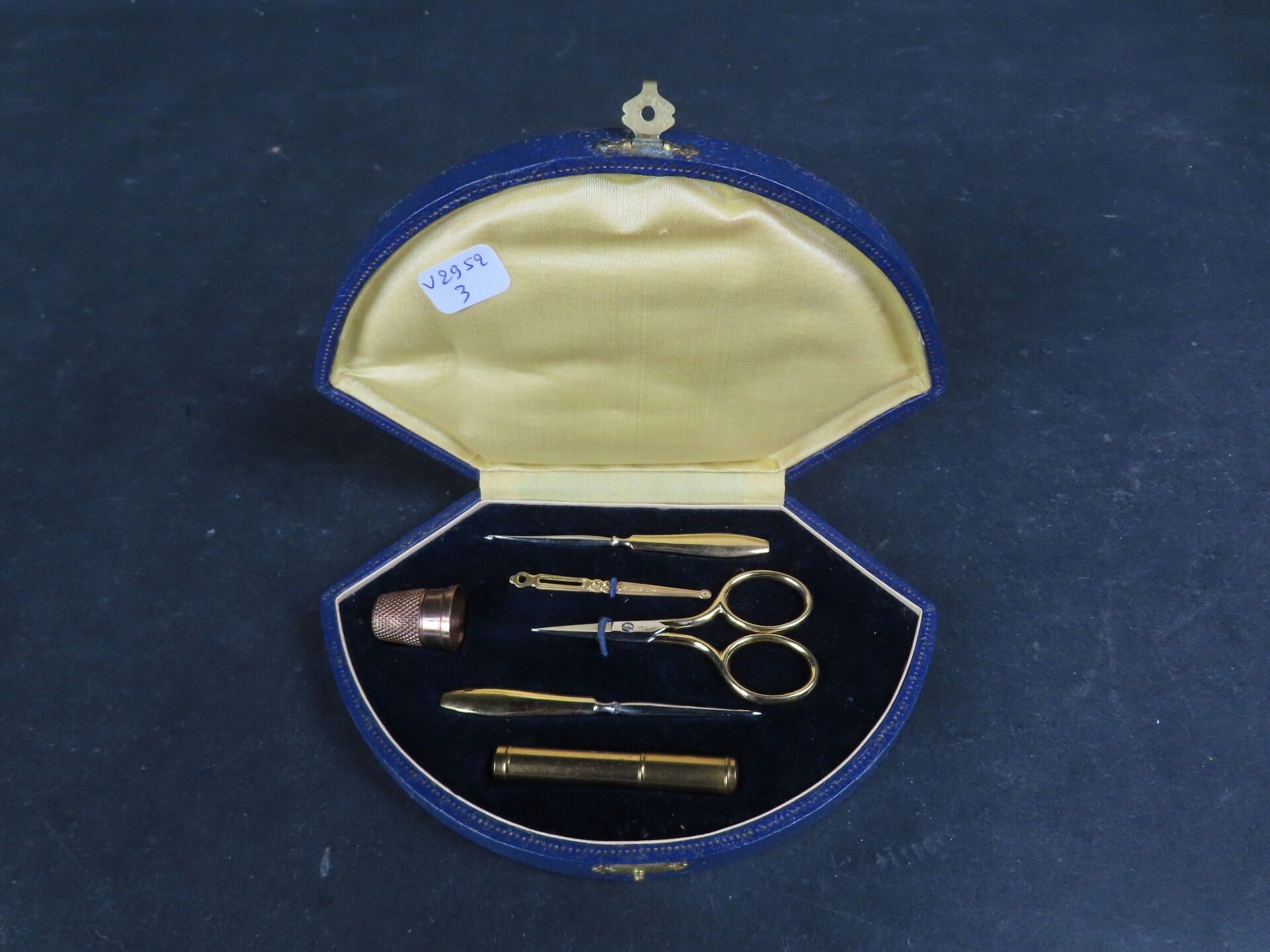 Nécessaire à couture en métal et métal doré contenant six pièces dont paire de ciseaux, dé à coudre, étui à aiguilles et divers. Avec écrin