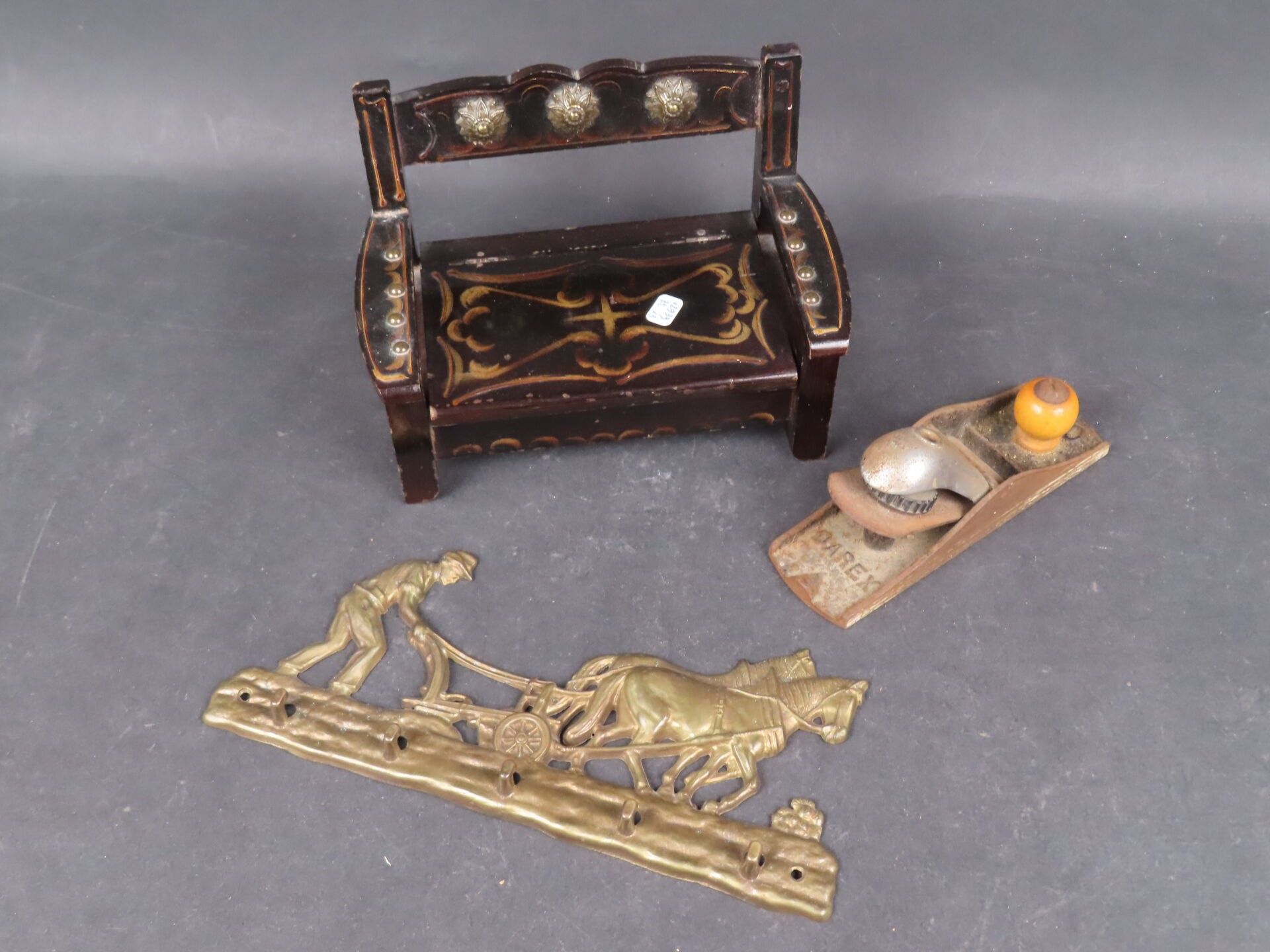 Lot comprenant : 1 boîte en bois laqué en forme de banc (L. 21 cm), 1 rabot à bois manuel DAREX, 1 support mural en métal patiné représentant un laboureur (L. 26 cm)