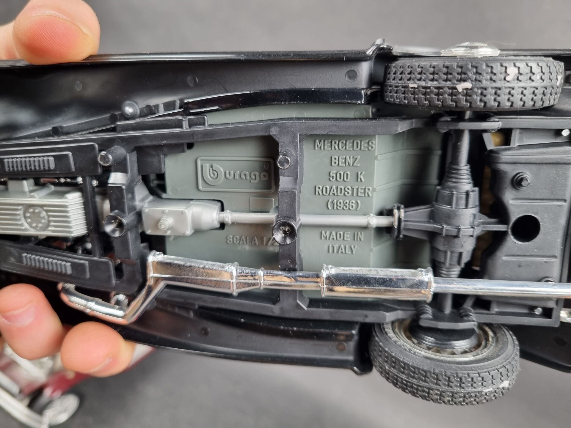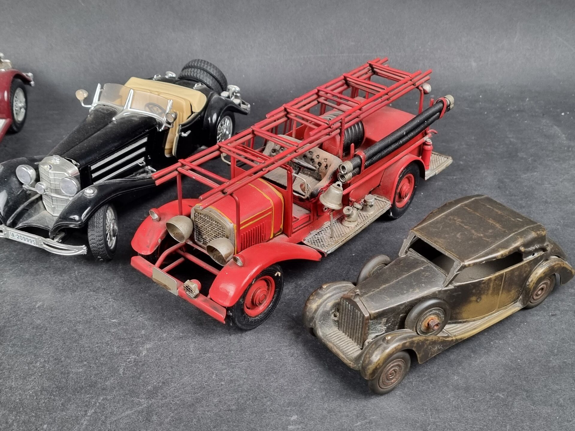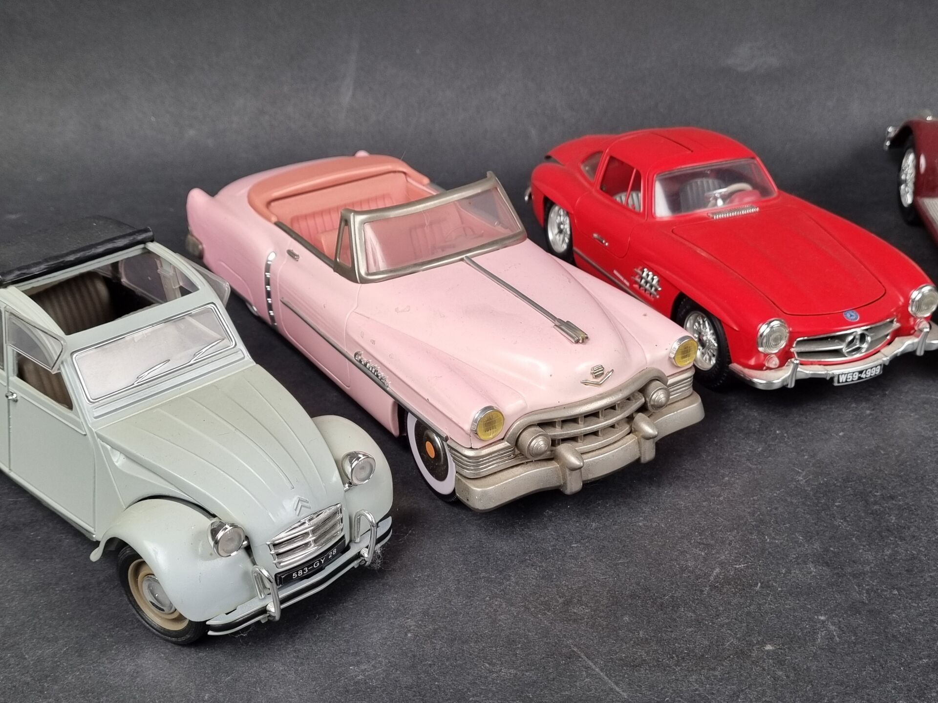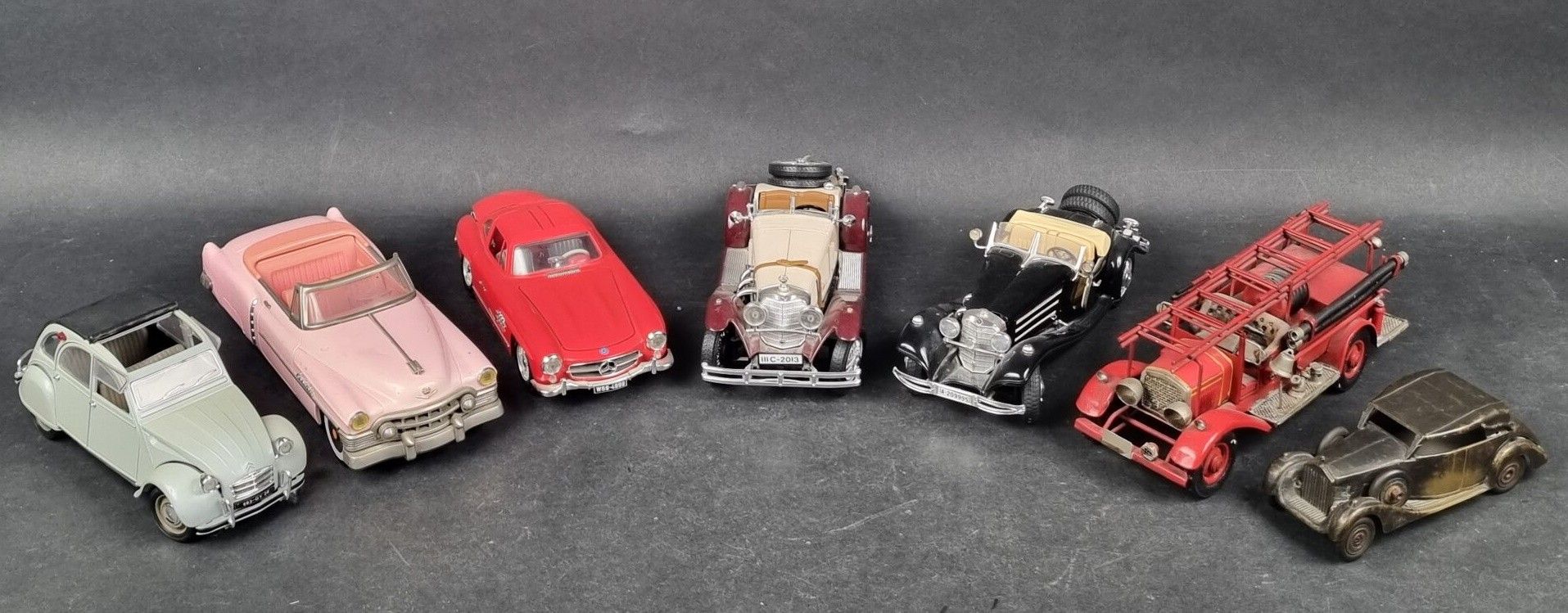 Lot de 7 voitures miniatures, diverses marques dont Solido et Burago et divers modèles dont Citroën 2CV, Mercedes 300 SL, Cadillac, etc.