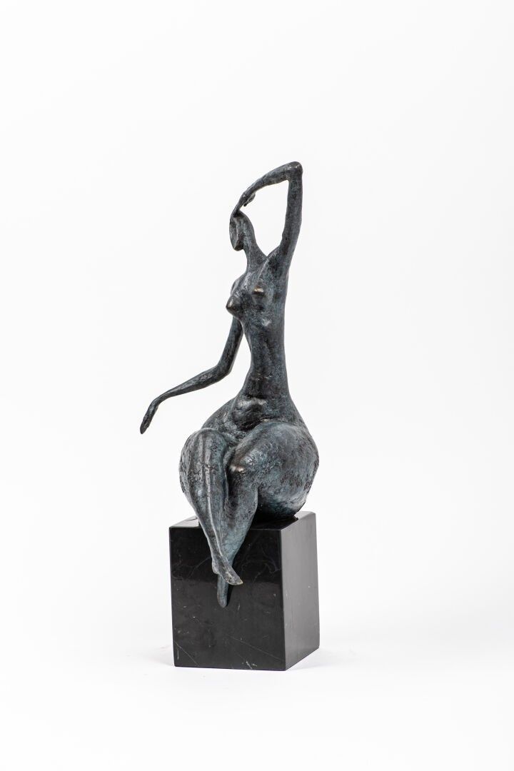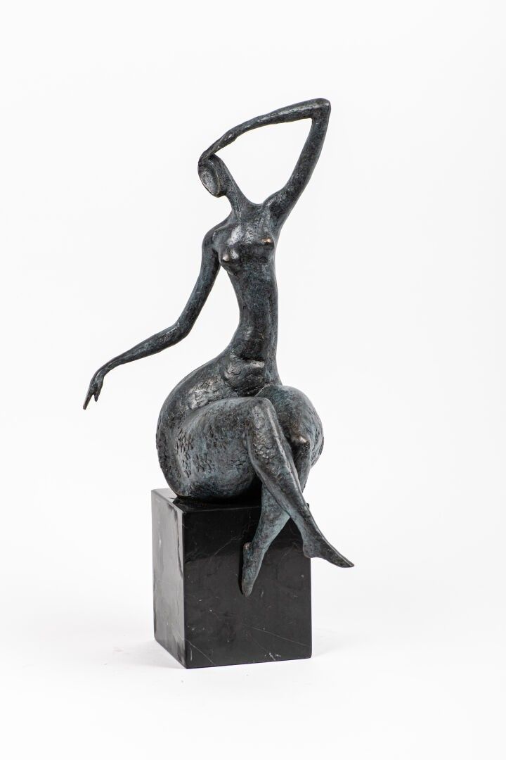MILO (XXe). "Femme assise", sujet en bronze à bleue nuancée, base en marbre noir (H : 42 cm)