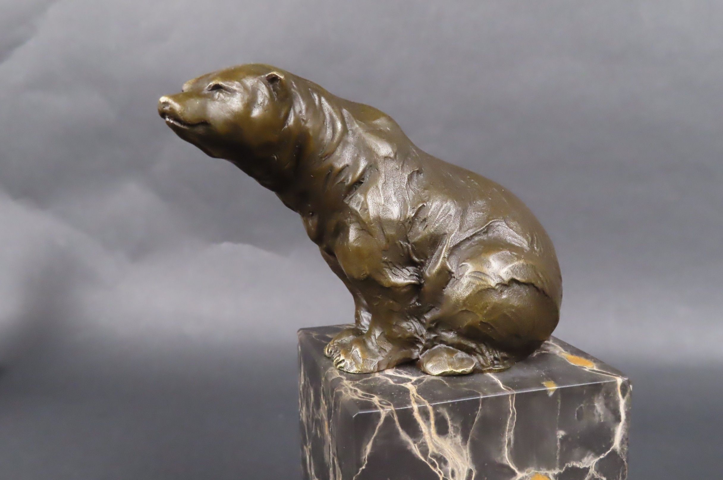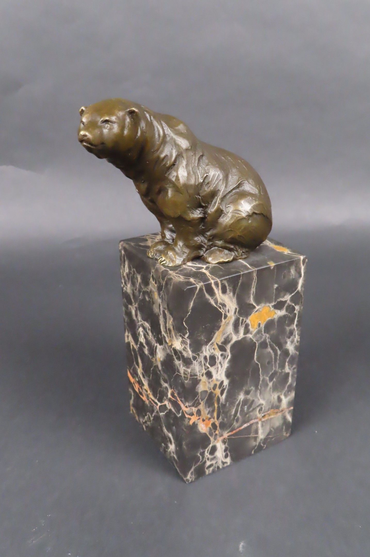MILO (XXe). "Ours assis", sujet en bronze patiné sur une base en marbre noir veiné, signé et cachet de fondeur, fonte moderne (21,5 x 8 x 8 cm) (petit éclat au marbre)
