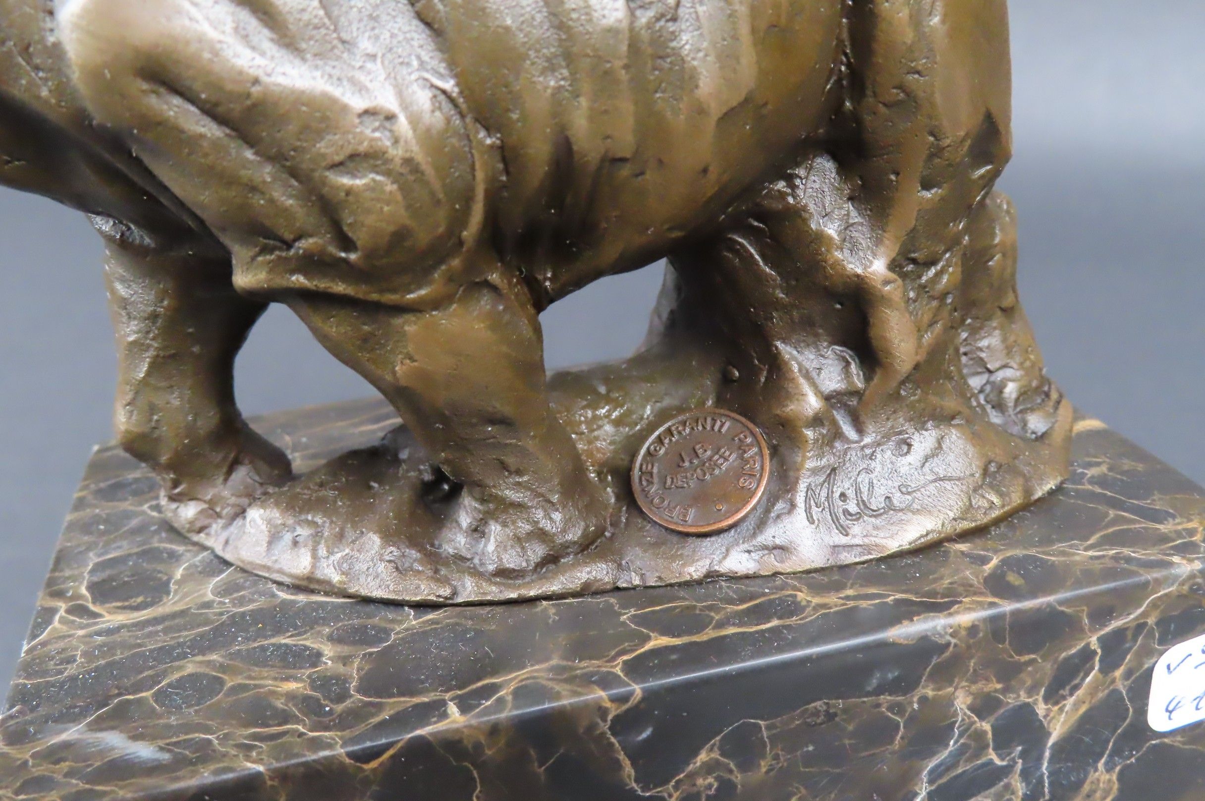 MILO (XXe) "Rhinocéros", sujet en bronze patiné sur une base en marbre noir veiné, signé, cachet de fondeur (19 x 13 x 8 cm)